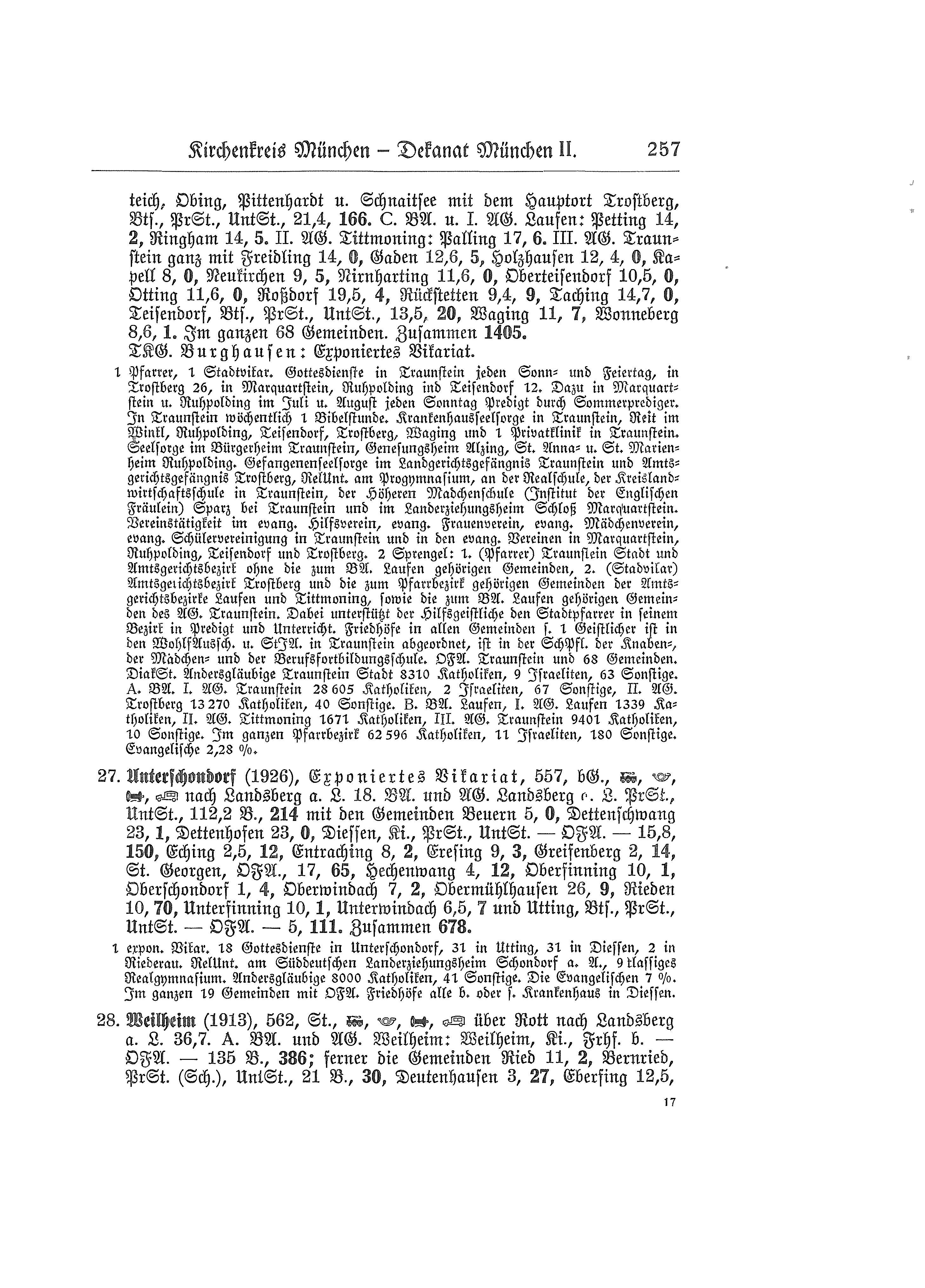 ([seit] 1915), 599 m, Unmittelbare Stadt, Bahn, Post, Telefon, Bus nach Seebruck 17,6 km, Palling 16,6 km, Inzell-Lofer 46,4 km, Übersee-Marquartstein-Reit i. W. 40,3 km, Neukirchen bei Teisendorf 15,8 km. A. Unmittelbare Stadt Traunstein, Kirche, Friedhof bürgerlich - Schulpflegschaft - 199 Bahnkilometer, 646 Seelen. B. Bezirksamt und I. Amtsgericht Traunstein: Alle Gemeinden mit den Hauptorten Bergen, Unterrichtsstation, 6,7 km, 45 Seelen. Grassau mit Marquartstein, Predigtstation, Unterrichtsstation, 23,4 km, 46 Seelen, Reit i. W., Unterrichtsstation, 36,2 km, 7 Seelen, Ruhpolding, Predigtstation, Unterrichtsstation, 13,2 km, 60 Seelen, Siegsdorf, Unterrichtsstation, 5,4 km, 20 Seelen, Übersee, Unterrichtsstation, 15 km, 46 Seelen. II. Amtsgericht Trostberg: Alle Gemeinden mit Ausnahme von Alberteich,