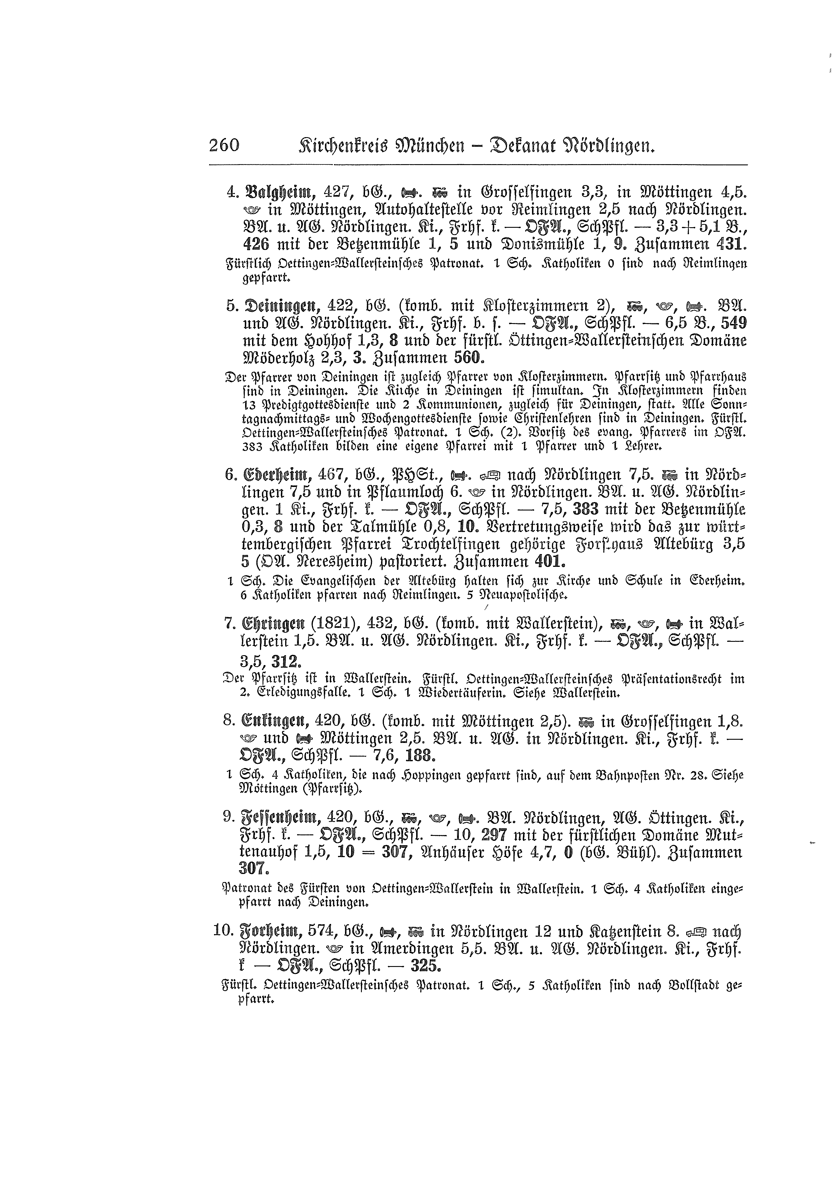 546 m, bürgerliche Gemeinde, Telefon, Bahn in Nördlingen 12,7 km und Katzenstein 10,3 km, Bus nach Nördlingen 12,7 km, Post in Amerdingen 2,8 km. Bezirksamt und Amtsgericht Nördlingen. Kirche, Friedhof konfessionell evangelisch - Ortsfürsorgeausschuß (Pfarrer Vorsitz), Schulpflegschaft - 285 Seelen. Charitativ pastoriert werden die Evangelischen in Amerdingen 2,8 km, 0 Seelen, Seelbronner Hof 1,5 km, 0 Seelen, und in den württembergischen Orten Eglingen 5 km, 3 Seelen, Dunstelkingen 7 km, 2 Seelen, Sturmmühle 5,5 km, 6 Seelen. Zusammen 285 Seelen.