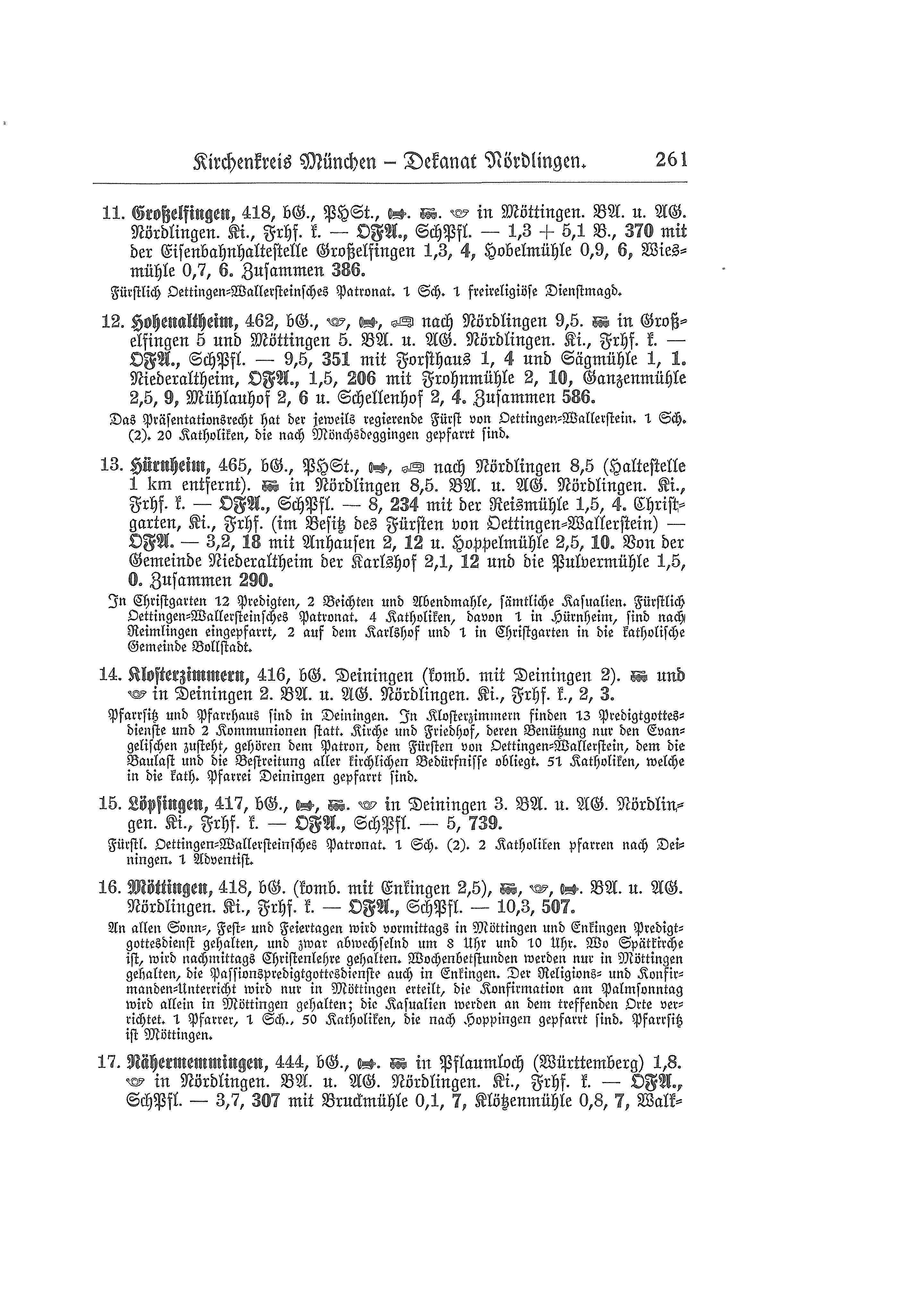 ([seit] 1821), 432 m, bürgerliche Gemeinde (kombiniert mit Wallerstein), Bahn, Post, Telefon in Wallerstein 1,5 km. Bezirksamt und Amtsgericht Nördlingen. Kirche, Friedhof konfessionell evangelisch - Ortsfürsorgeausschuß (Pfarrer Vorsitz), Schulpflegschaft - 3,5 km, 312 Seelen.