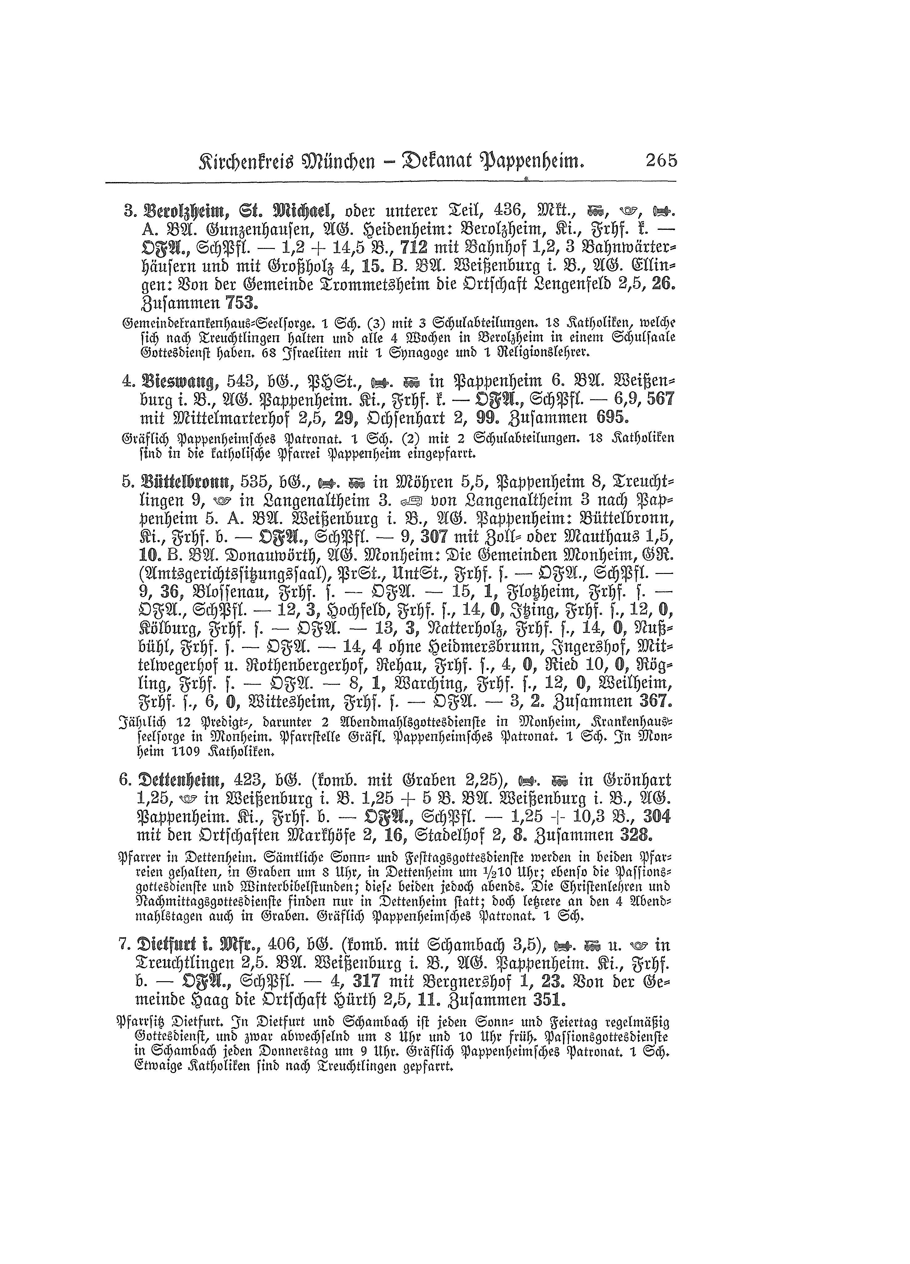 406 m, Stadt, Bahn, Post, Telefon. Bezirksamt Weißenburg i. B., Amtsgericht Pappenheim. Kirche, Friedhof bürgerlich - Ortsfürsorgeausschuß, Schulpflegschaft - 1491 Seelen mit Grafenmühle 3 km, 3 Seelen, Papiermühle 1,7 km, 12 Seelen, Wasenmeisterei 1 km, 7 Seelen, Geislohe (ohne Flemmmühle), Ortsfürsorgeausschuß (Pfarrer Vorsitz) Schulpflegschaft, 4 km, 169 Seelen, Göhren, Ortsfürsorgeausschuß (Pfarrer Vorsitz), Schulpflegschaft, 3,5 km, 238 Seelen. Zusammen 1.920 Seelen.