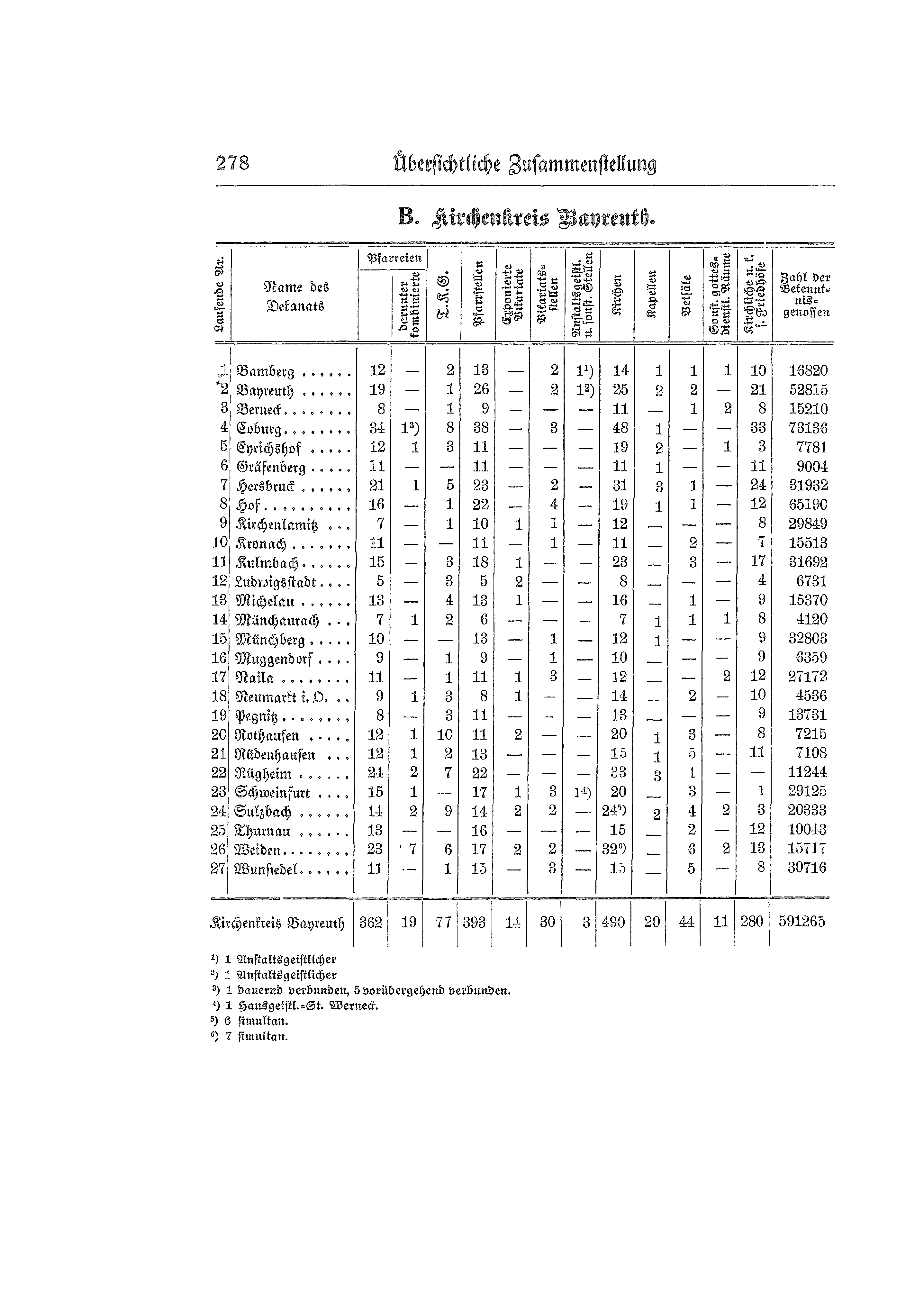 | Lau- fen- de Nr. | Name des Dekanats | Pfarreien | davon refor- mierte | Tochter- kirchen- gemeinden | Pfarr- stellen | Exponierte Vikariate | Vikariats- stellen | Anstalts- geistliche und sonstige Stellen | Kirchen | Kapel- len | Bet- sääle | Sonstige gottes- dienstliche Räume | Kirchliche und konfessionell simultane Friedhöfe | Zahl der Bekenntnis- genossen |