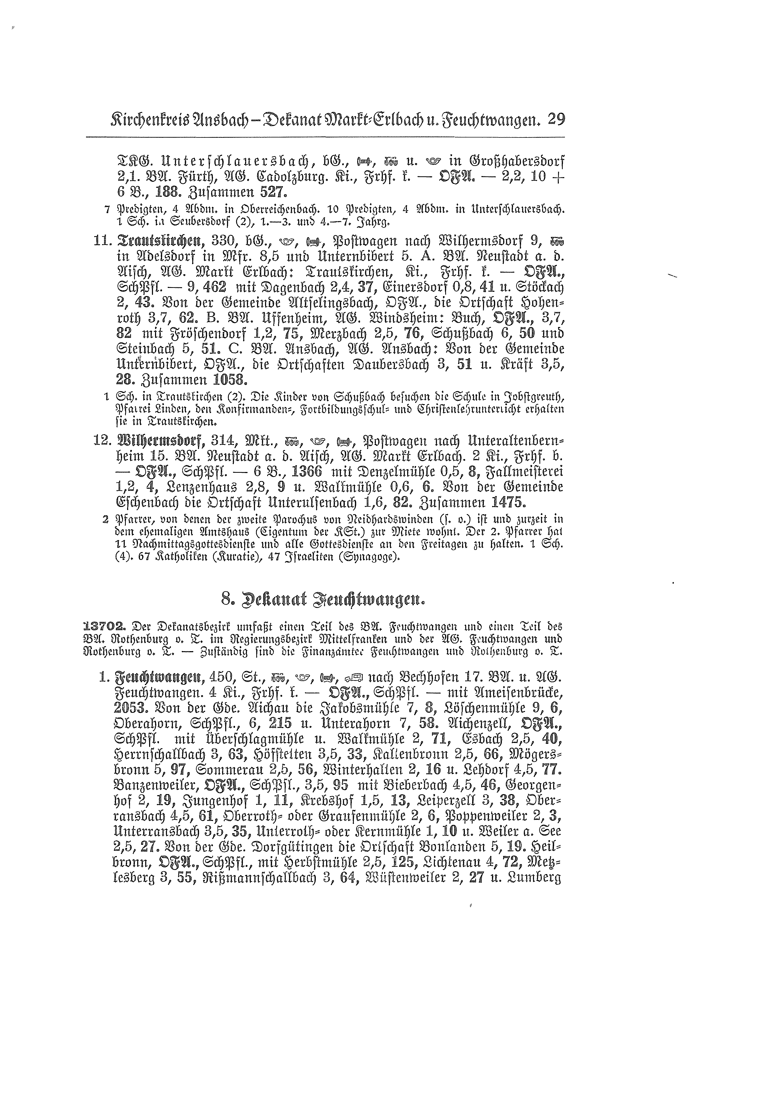 384 m, bürgerliche Gemeinde (komb. mit Wilhermsdorf II 5,9 km), Telefon, Bahn in Emskirchen 5 km, Post in Markt Erlbach 4,5 km. Bezirksamt Neustadt a. d. Aisch, Amtsgericht Markt Erlbach. Kirche, Friedhof konfessionell evangelisch - Ortsfürsorgeausschuß (Pfarrer Vorsitz), Schulpflegschaft - 4,5 km, 202 Seelen mit Finkenmühle 1,2 km, 8 Seelen. Von der Gemeinde Buchklingen, Ortsfürsorgeausschuß, die Holzmühle 1,7 km, 12 Seelen. Kotzenaurach, Ortsfürsorgeausschuß, 2,5 km, 86 Seelen. Zusammen 308 Seelen.