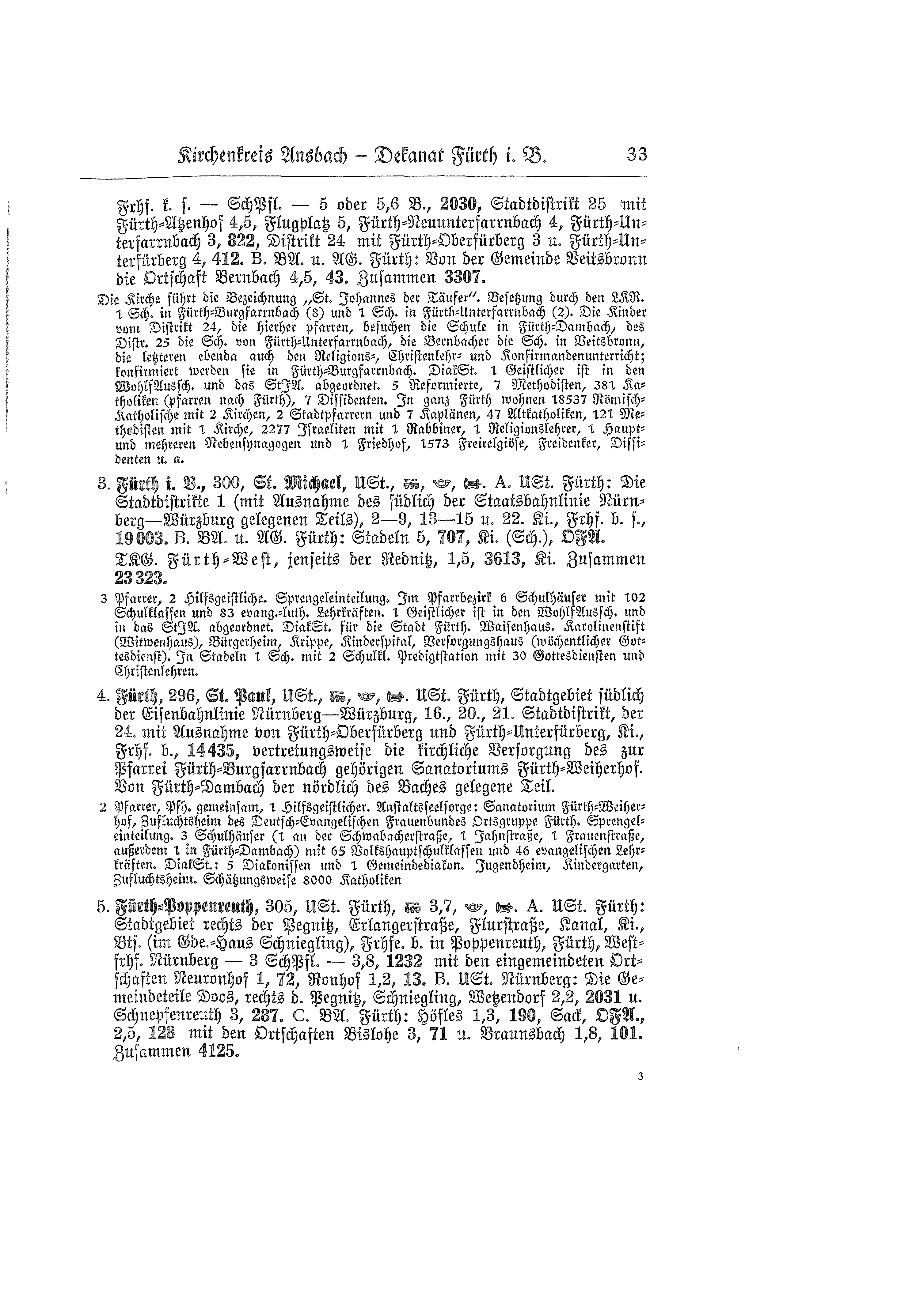 87.426 Seelen. Der Dekanatsbezirk umfaßt ganz den Bezirk der unmittelbaren Stadt Fürth i. B. und teilweise Bezirke der unmittelbaren Stadt Nürnberg, ebenso teilweise Bezirke der Bezirksämter: Fürth, Nürnberg, Höchstadt a. A. und Schwabach im Regierungsbezirk Mittelfranken und Oberfranken. Er umfaßt ferner teilweise die AG.: Fürth i. B., Nürnberg, Cadolzburg (nach Auflösung zu Fürth), Herzogenaurach und Schwabach im Gebiet der Landgerichte: Fürth und Nürnberg. Für das ganze Gebiet zuständig das Oberlandesgericht Nürnberg. Zuständig sind die Finanzämter: Fürth, Nürnberg, Cadolzburg (nach Auflösung zu Fürth), Herzogenaurach, Schwabach.
