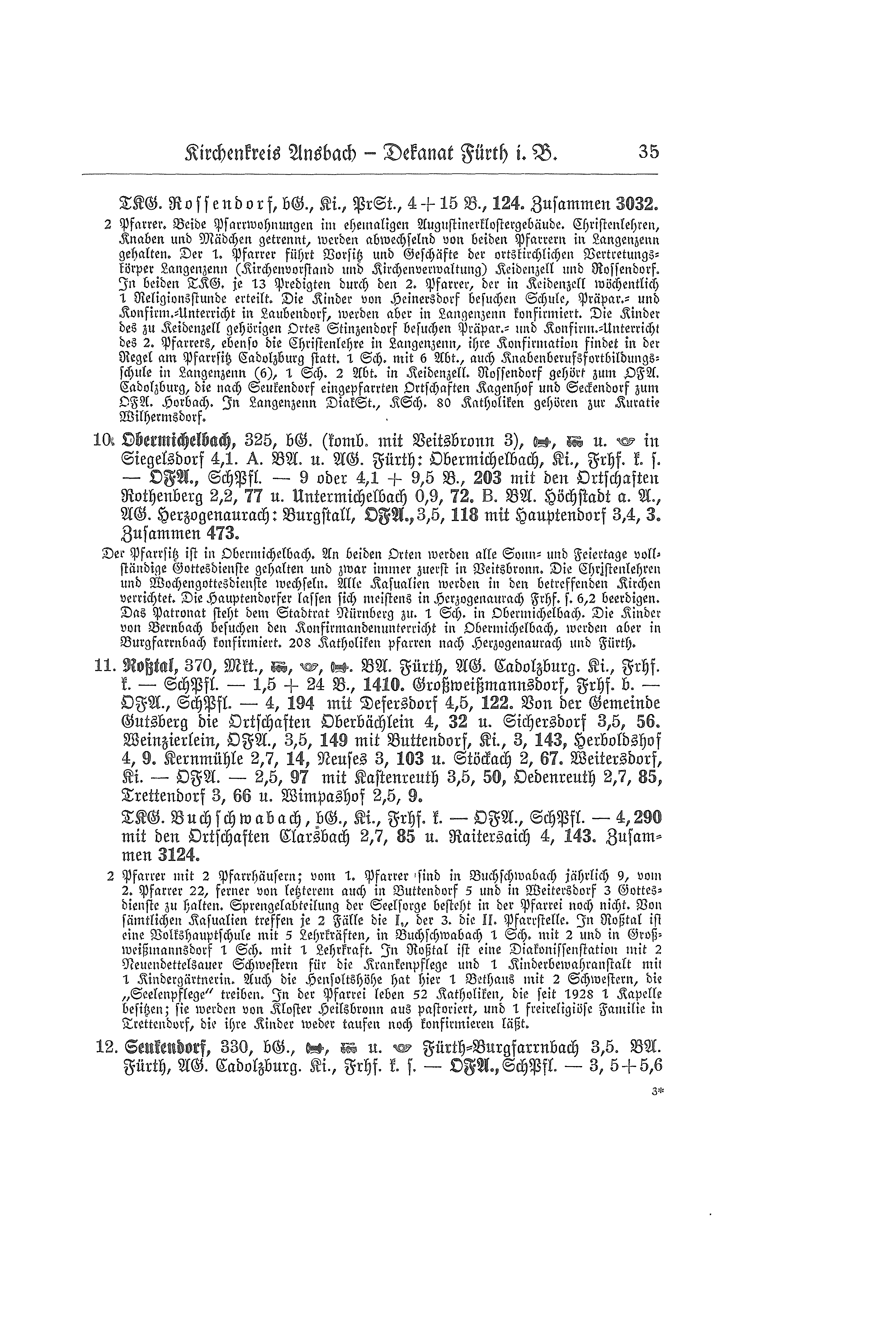307 m, Stadt, Bahn, Post, Telefon. Bezirksamt Fürth, Amtsgericht Cadolzburg. Kirche, Friedhof mit Kapelle konfessionell evangelisch simultan - Ortsfürsorgeausschuß (Pfarrer Vorsitz), Schulpflegschaft - 15 Bahnkilometer, 2.018 Seelen mit Alizberg 2,2 km, Gauchsmühle 1,3 km, Lohmühle 1 km, Neumühle 0,3 km und Wasenmühle 1,2 km. Horbach, Ortsfürsorgeausschuß (Pfarrer Vorsitz), 2,3 km, 132 Seelen, mit den Ortschaften Göckershof 2,2 km, 16 Seelen, Hausen 3,5 km, 32 Seelen und Raindorf 4,2 km, 107 Seelen. Von der Gemeinde Keidenzell die Ortschaften Burggrafenhof 2 km, 142 Seelen und Klaushof 2,8 km, 27 Seelen. Von der Gemeinde Laubendorf die Ortschaften Hardhof 2 km, 13 Seelen, Heinersdorf mit Mühle 4,5 km, 108 Seelen und Lohe 3 km, 53 Seelen.
