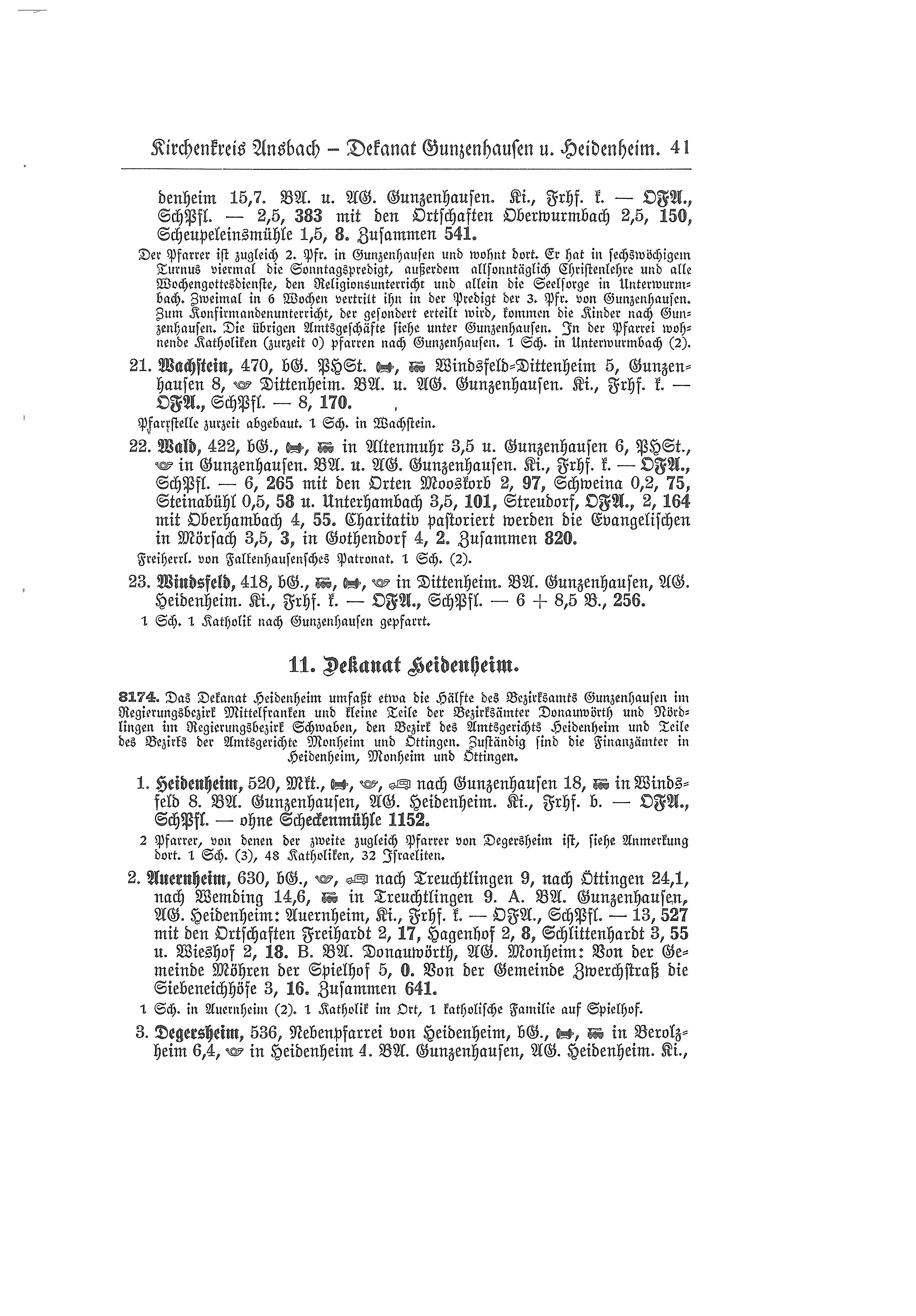 416 m, bürgerliche Gemeinde, Posthilfsstation, Telefon, Bahn in Gunzenhausen 4 km und Windsfeld 3,5 km, Post in Gunzenhausen. Bezirksamt und Amtsgericht Gunzenhausen. Kirche, Friedhof konfessionell evangelisch - Ortsfürsorgeausschuß (Pfarrer Vorsitz), Schulpflegschaft - 3,5 km, 157 Seelen mit Frickenfelden, Ortsfürsorgeausschuß (Pfarrer Vorsitz), Schulpflegschaft, 4 km, 214 Seelen. Zusammen 371 Seelen.