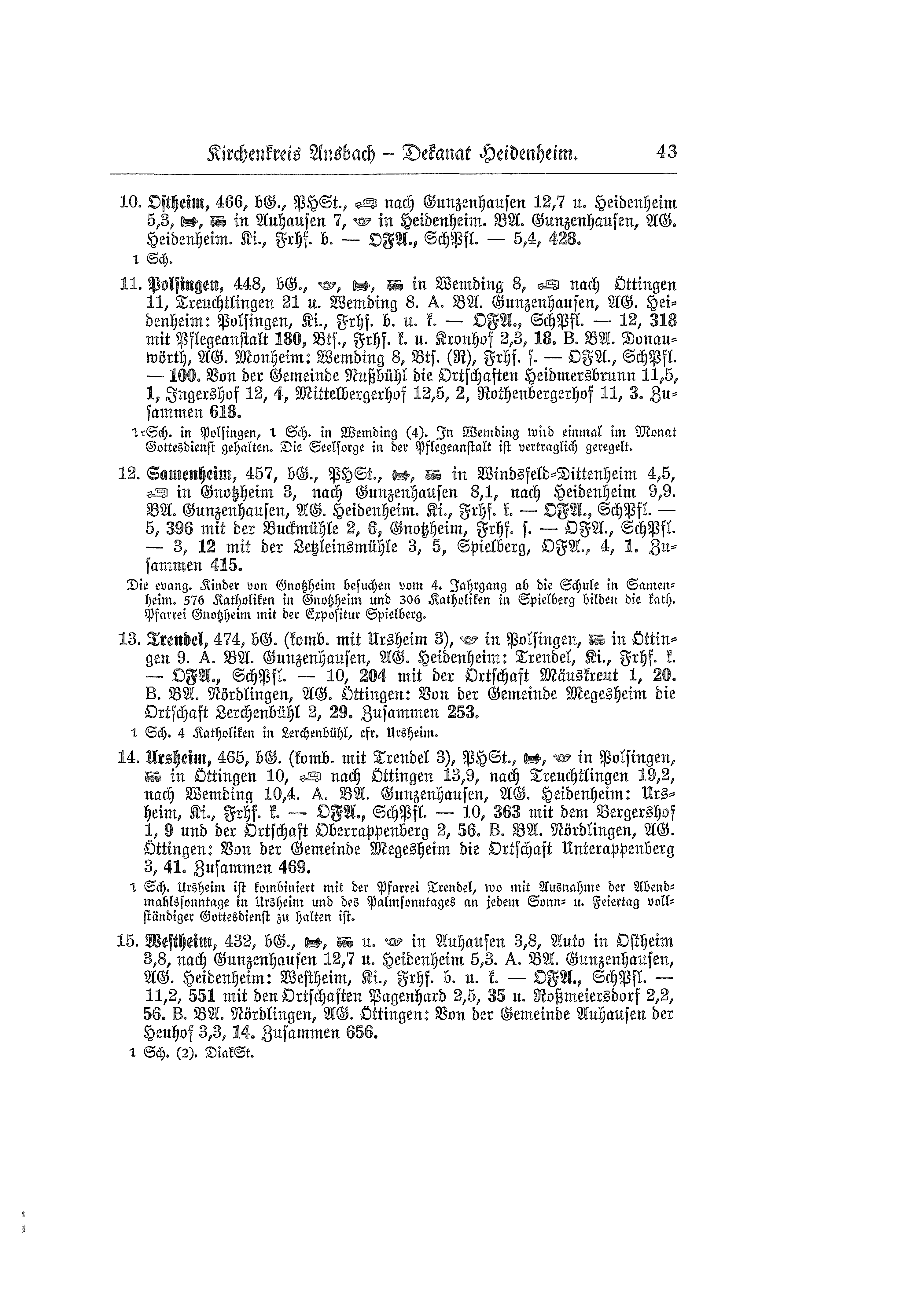 436 m, bürgerliche Gemeinde, Post, Telefon, Bahn in Ehlheim 2,5 km. Bezirksamt Gunzenhausen, Amtsgericht Heidenheim. Kirche, Friedhof bürgerlich - Ortsfürsorgeausschuß (Pfarrer Vorsitz), Schulpflegschaft - 7 km, 630 Seelen mit unterer Blosenmühle 1,7 km, 5 Seelen, oberer Blosenmühle 0,7 km, 6 Seelen und Oberweiler 2,5 km, 34 Seelen. Wolfsbronn, Ortsfürsorgeausschuß (Pfarrer Vorsitz), 2,5 km, 96 Seelen mit Baierleinsmühle 2 km, 6 Seelen, Papiermühle 3,5 km, 4 Seelen und Sägmühle 3 km, 5 Seelen. Zusammen 786 Seelen.