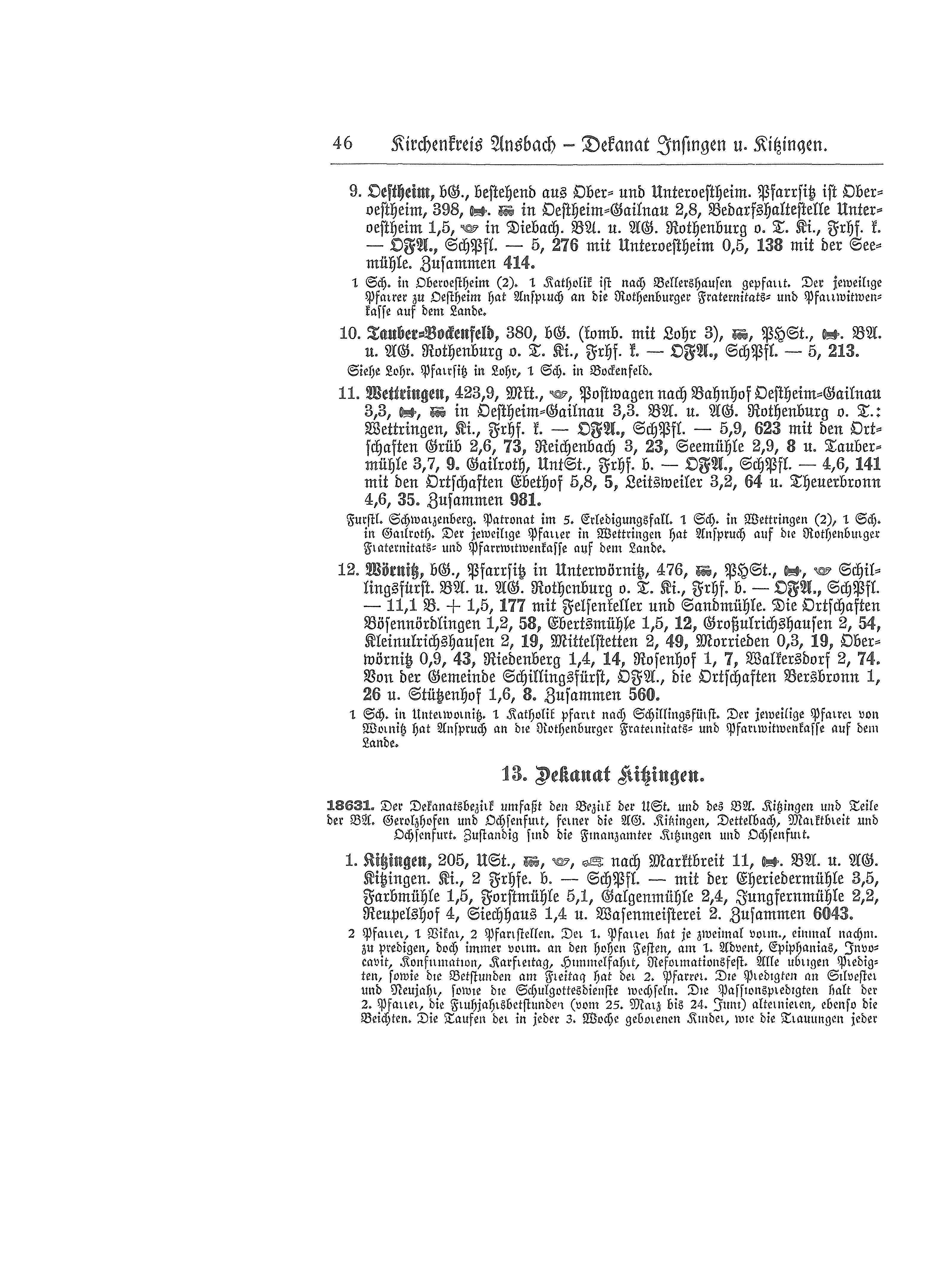 512 m, Markt. Schillingsfürst (zusammenhängend und vereinigt mit dem ebenfalls marktberechtigten Frankenheim zu einer politischen Marktgemeinde), Post, Telefon Schilllingsfürst. Bezirksamt und AmtsgerichtRothenburg o.T. 9,5 Bahnkilometer + 1,5 km. Schillingsfürst, Ortsfürsorgeausschuß (Pfarrer Vorsitz), 452 Seelen mit Marienhof 2 km, 7 Seelen, Schafhof 88 Seelen und Ziegelhütte 2 km, 23 Seelen. Frankenheim, Kirche, 2 Friedhöfe bürgerlich -Schulpflegschaft - 404 Seelen mit Fischhaus 1,6 km, 0 Seelen, Ölmühle 1,5 km, 3 Seelen, Schmeermühle 1 km, 0 Seelen, Thiergartenhof 1,5 km, 10 Seelen und Wittum 1,8 km, 15 Seelen. Bellershausen, Friedhof simultan -Ortsfürsorgeausschuß (Pfarrer Vorsitz) - 3,2 km, 75 Seelen mit der Neumühle 4,5 km, 5 km und Pfeffermühle 4,5 km, 4 Seelen. Stilzendorf, Ortsfürsorgeausschuß, 1,4 km, 112 Seelen mit Bronnenhaus 1,4 km, 2 Seelen. Zusammen 1.200 Seelen.