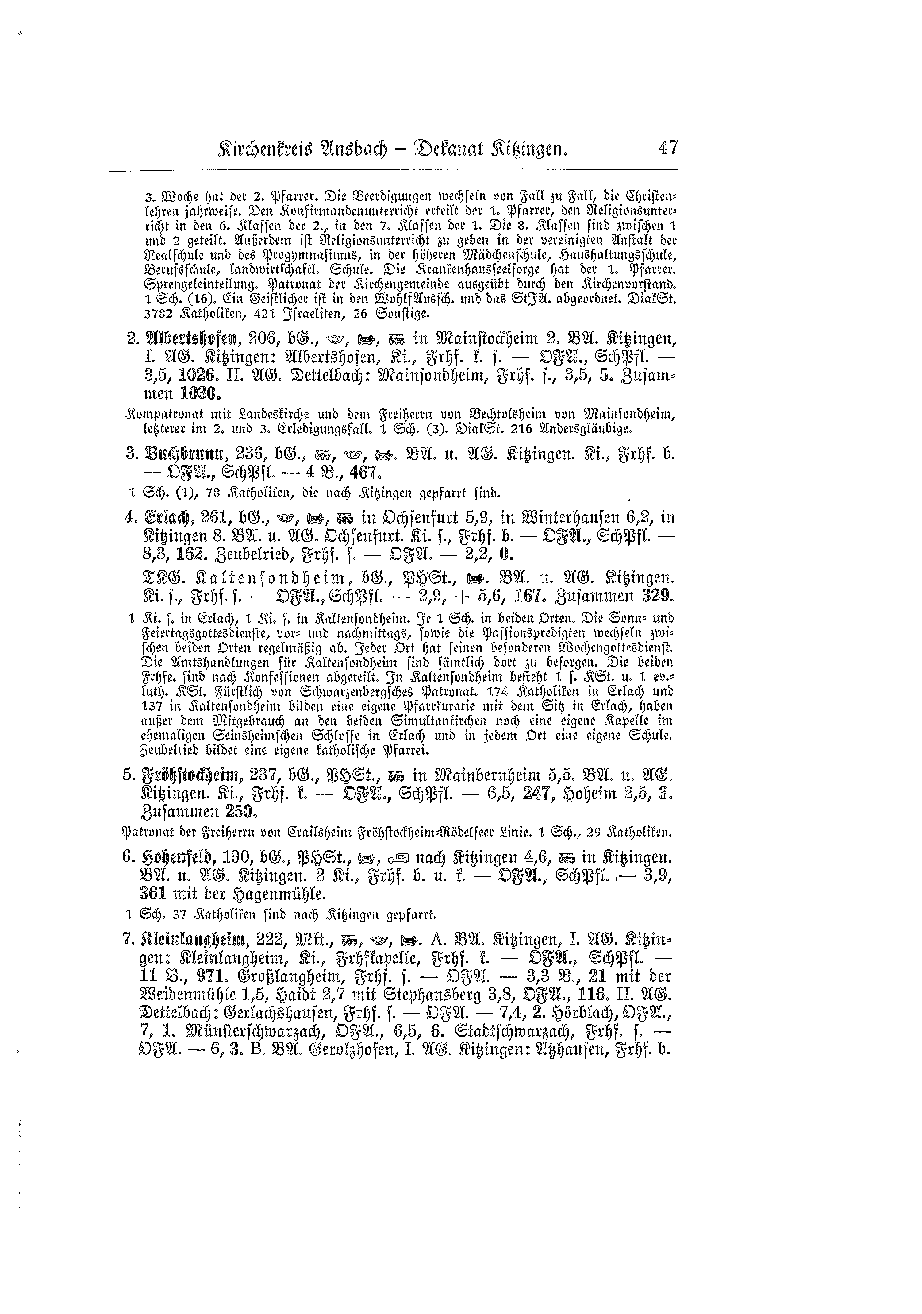 205 m, Unmittelbare Stadt, Bahn, Post, Bus nach Marktbreit 11 km, Telefon. Bezirksamt und Amtsgericht Kitzingen. Kirche, 2 Friedhöfe bürgerlich - Schulpflegschaft - mit der Eheriedermühle 3,5 km, Farbmühle 1,5 km, Forstmühle 5,1 km, Galgenmühle 2,4 km, Jungfernmühle 2,2 km, Reupelshof 4 km, Siechhaus 1,4 km und Wasenmeisterei 2 km. Zusammen 6.043 Seelen. 2 Pfarrer, 1 Vikar, 2 Pfarrstellen. Der 1. Pfarrer hat je zweimal vormittags, einmal nachmittags zu predigen, doch immer vormittags an den hohen Festen, am 1. Advent, Epiphanias, Invocavit, Konfirmation, Karfreitag, Himmelfahrt, Reformationsfest. Alle übrigen Predigten, sowie die Betstunden am Freitag hat der 2. Pfarrer. Die Predigten an Silvester und Neujahr, sowie die Schulgottesdienste wechseln. Die Passionspredigten hält der 2. Pfarrer, die Frühjahrsbetstunden (vom 25. März bis 24. Juni) alternieren, ebenso die Beichten. Die Taufen der in jeder 3. Woche geborenen Kinder, wie die Trauungen jeder 3. Woche hat der 2. Pfarrer.