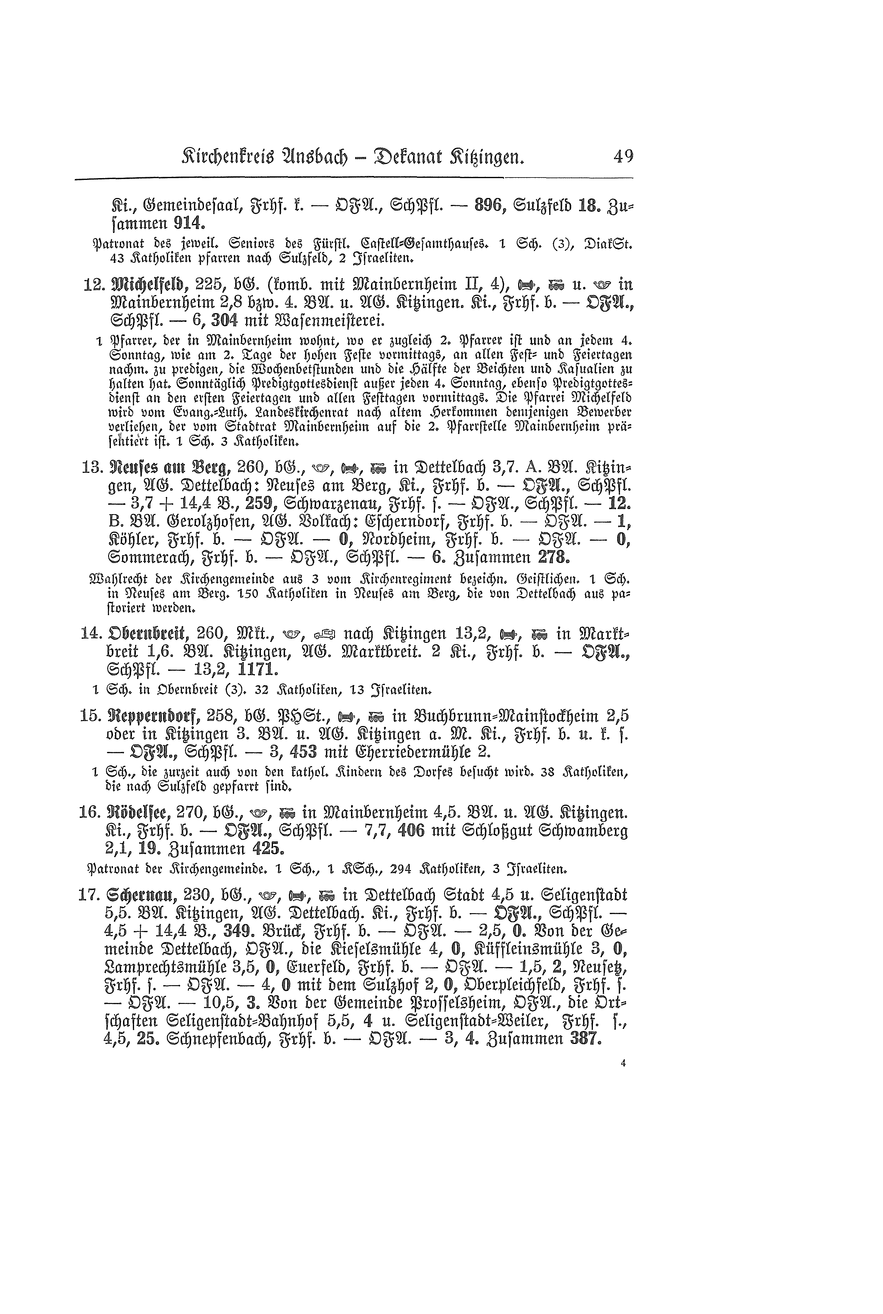 210 m, bürgerliche Gemeinde, Bahn, Post, Telefon. Bezirksamt Kitzingen, Amtsgericht Dettelbach. Kirche, Friedhof konfessionell evangelisch simultan - Ortsfürsorgeausschuß (Pfarrer Vorsitz), Schulpflegschaft - 3,4 km, 997 Seelen, Bibergau, Friedhof simultan, 5 km, 10 Seelen mit Dettelbach, Friedhof simultan, 3,7 km, 25 Seelen ohne Kiesels-, Küffleins- und Lamprechtsmühle, Effeldorf, Friedhof simultan, 7 km, 8 Seelen. Zusammen 1.040 Seelen.
