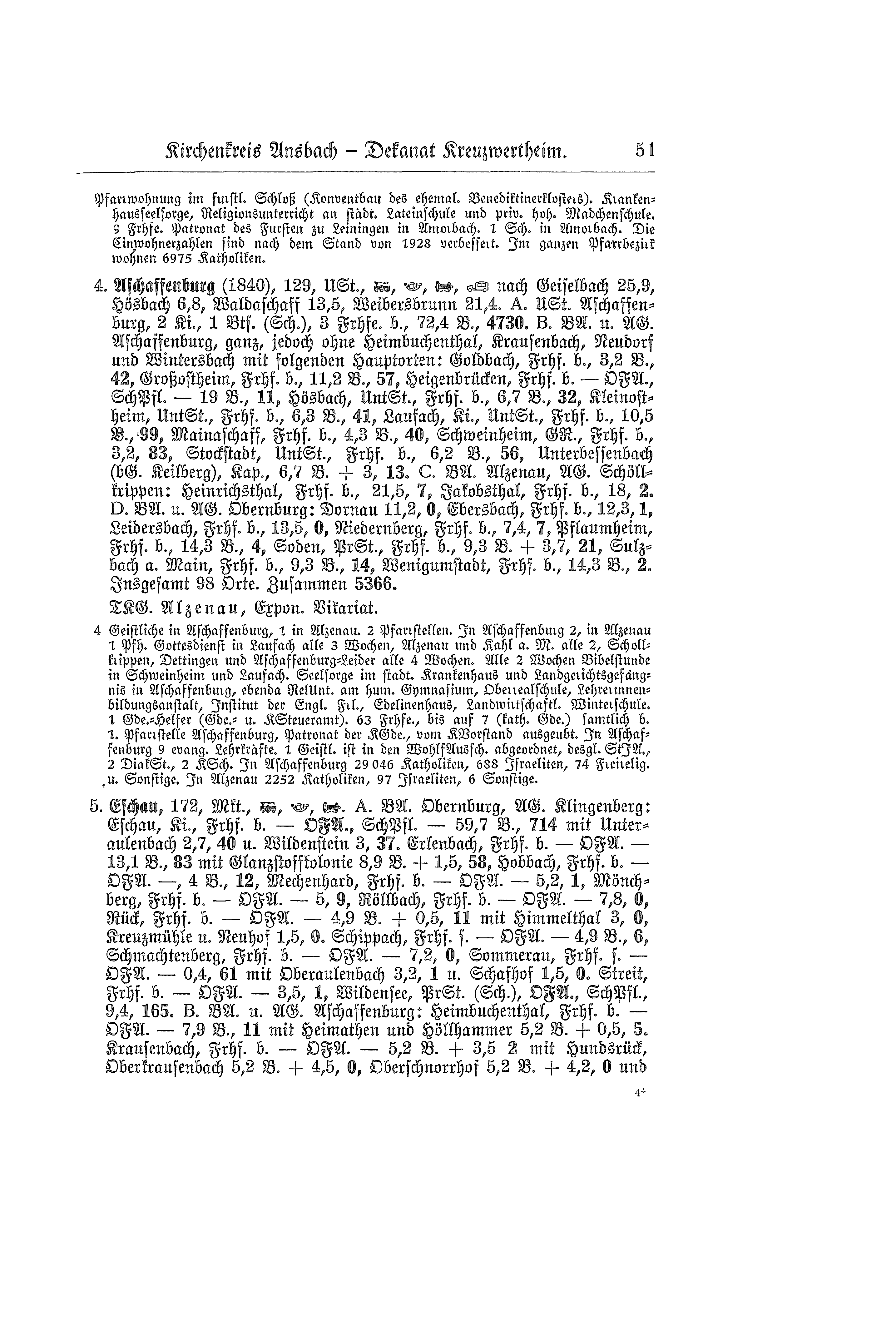 13.380 Seelen. Der Dekanatsbezirk umfaßt die Bezirksämter Alzenau, Aschaffenburg, Marktheidenfeld, Miltenberg und Obernburg und den Bezirk der unmittelbaren Stadt Aschaffenburg im Regierungsbezirk Unterfranken. Zuständig sind die Finanzämter Amorbach, Aschaffenburg, Klingenberg und Lengfurt.