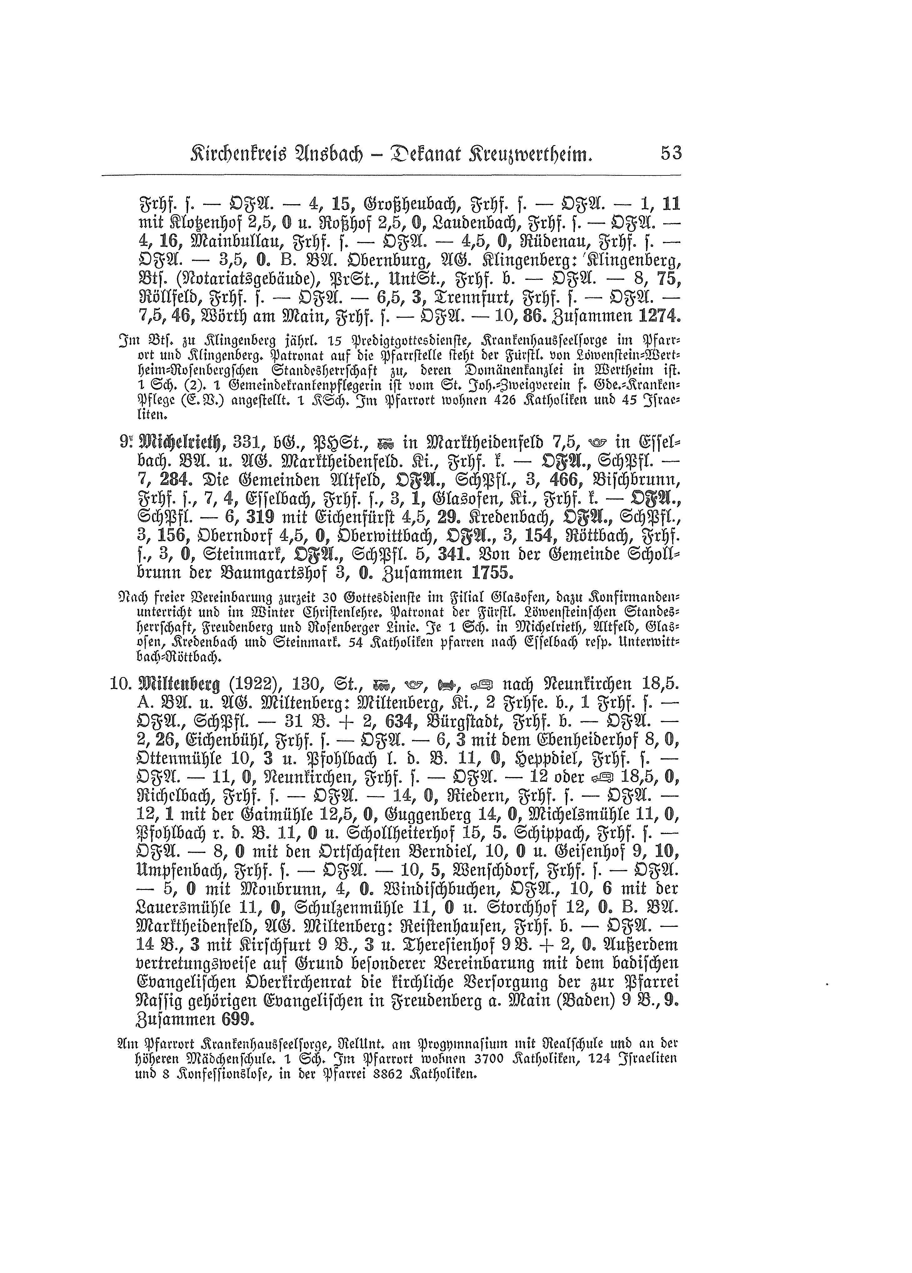 Tochterkirchengemeinde Schollbrunn, Kirche, Friedhof bürgerlich - Ortsfürsorgeausschuß, Schulpflegschaft 6,8 km - 6,8 km + 5 Bahnkilometer + 1,2 km, 178 Seelen mit Karthause Grünau 4,3 km, 3 Seelen, Nickelsmühle 4,2 km, 0 Seelen, Schneidmühle 3 km, 6 Seelen und Schreckenmühle 5 km, 0 Seelen. Zusammen 187 Seelen. II. Amtsgericht Miltenberg: Breitenbrunn, Friedhof bürgerlich - Ortsfürsorgeausschuß - 5 Bahnkilometer + 2,4 km, 1 Seelen mit Gußhof. Dorfprozelten, Ortsfürsorgeausschuß, 10 Bahnkilometer, 4 Seelen mit Kollenberg. Faulbach, Friedhof bürgerlich - Ortsfürsorgeausschuß - 5 Bahnkilometer, 7 Seelen, Fechenbach, Friedhof bürgerlich - Ortsfürsorgeausschuß - 14 Bahnkilometer, 3 Seelen, Neuenbnch, Friedhof bürgerlich - Ortsfürsorgeausschuß - 5 Bahnkilometer + 3 km, 0 Seelen mit Hofthiergarten. Oberaltenbuch, Ortsfürsorgeausschuß, 5 Bahnkilometer + 7 km, 1 Seele, Stadtprozelten, Unterrichtsstation, Friedhof bürgerlich -Ortsfürsorgeausschuß - 8 Bahnkilometer, 15 Seelen, Unteraltenbuch, Friedhof bürgerlich - Ortsfürsorgeausschuß - 5 Bahnkilometer + 6,5 km, 3 Seelen mit Hofwildensee und Forsthaus Sylvan 5 Bahnkilometer + 6 km, 3 Seelen = 37 Seelen. Zusammen 890 Seelen.