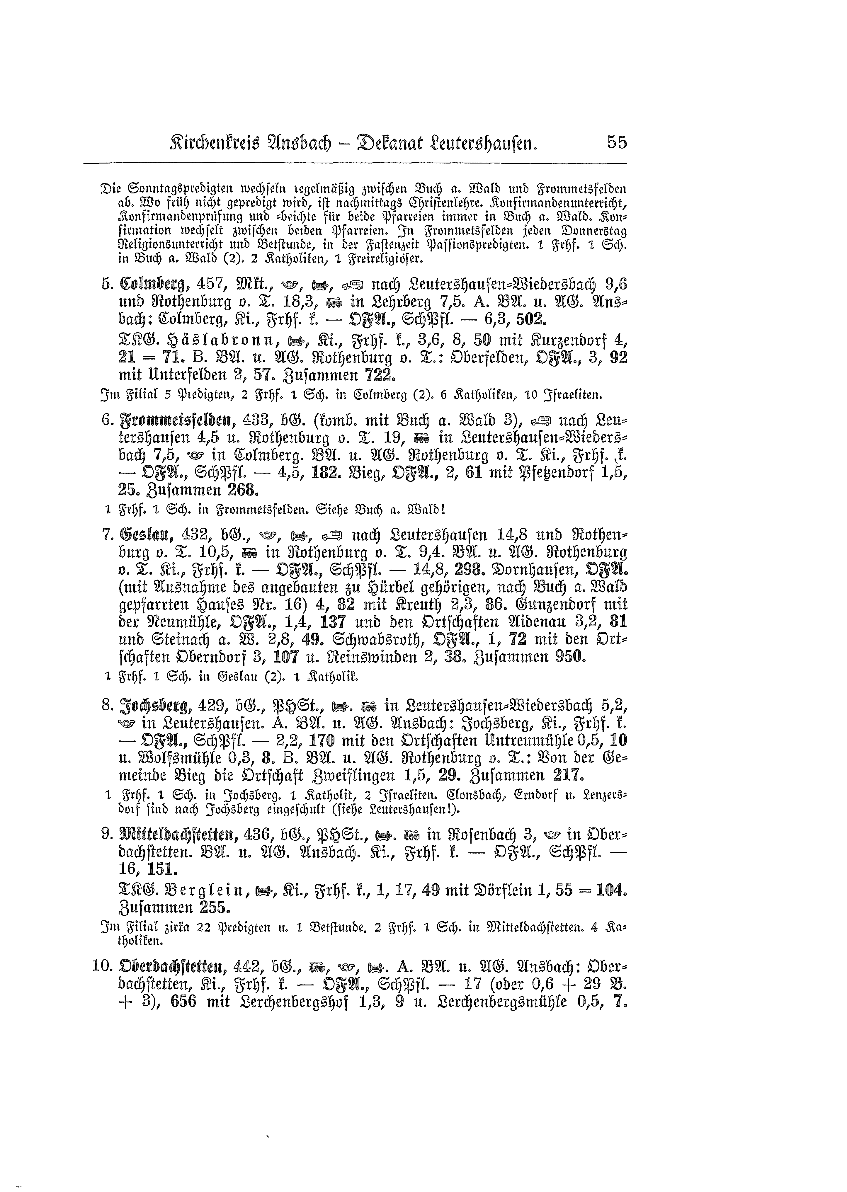 426 m, Stadt, Post, Telefon, Bus nach Wiedersbach 3 km und Rothenburg o. T. 25 km, Bahn in Leutershausen-Wiedersbach 3 km. A. Bezirksamt und Amtsgericht Ansbach: Leutershausen, 2 Kirchen, Friedhof konfessionell evangelisch - Ortsfürsorgeausschuß (Pfarrer Vorsitz), Schulpflegschaft - 1.357 Seelen. Von der Gemeinde Auerbach die Ortschaften Bauzenweiler 3,5 km, 20 Seelen und Kressenhof 2,6 km, 27 Seelen. Büchelberg, Bahn, Ortsfürsorgeausschuß (Pfarrer Vorsitz), Schulpflegschaft, 4 km, 108 Seelen mit den Ortschaften Atzenhofen 6,5 km, 24 Seelen, Dietenbronn 6,5 km, 0 Seelen, Eyerlohe 4,6 km, 8 Seelen und Röttenbach 6 km, 60 Seelen. Erlbach, Ortsfürsorgeausschuß (Pfarrer Vorsitz), 3 km, 101 Seelen mit den Ortschaften Hundshof 3 km, 7 Seelen, Sachsen 1 km, 162 Seelen, Steinbächlein 3,5 km, 22 Seelen und Waizendorf 4,1 km, 28 Seelen. Von der Gemeinde Jochsberg die Ortschaften Clonsbach 4,3 km, 51 Seelen, Erndorf 2,2 km, 13 Seelen und Lenzersdorf 2,6 km, 36 Seelen. Mittelramstadt, Ortsfürsorgeausschuß (Pfarrer Vorsitz), 3,7 km, 90 Seelen mit den Ortschaften Froschmühle 1,5 km, 5 Seelen, Rammersdorf 1,9 km, 10 Seelen und Winden 2,6 km, 111 Seelen. Rauenbuch, Ortsfürsorgeausschuß (Pfarrer Vorsitz), 2,9 km, 39 Seelen mit den Ortschaften Görchsheim 2,8 km, 43 Seelen und Weißenmühle 4 km, 7 Seelen. Von der Gemeinde Wiedersbach die Holzmühle 2,9 km, 5 Seelen. B. Bezirksamt und Amtsgericht Rothenburg o. T.: Von der Gemeinde Bieg die Ortschaft Hochstetten 3,9 km, 56 Seelen. C. Bezirksamt Feuchtwangen, Amtsgericht Herrieden: Aurach 6,7 km, 5 Seelen und Schloß Wahrberg 7,9 km, 11 Seelen (das charitativ pastoriert wird). Zusammen 2.395 Seelen.