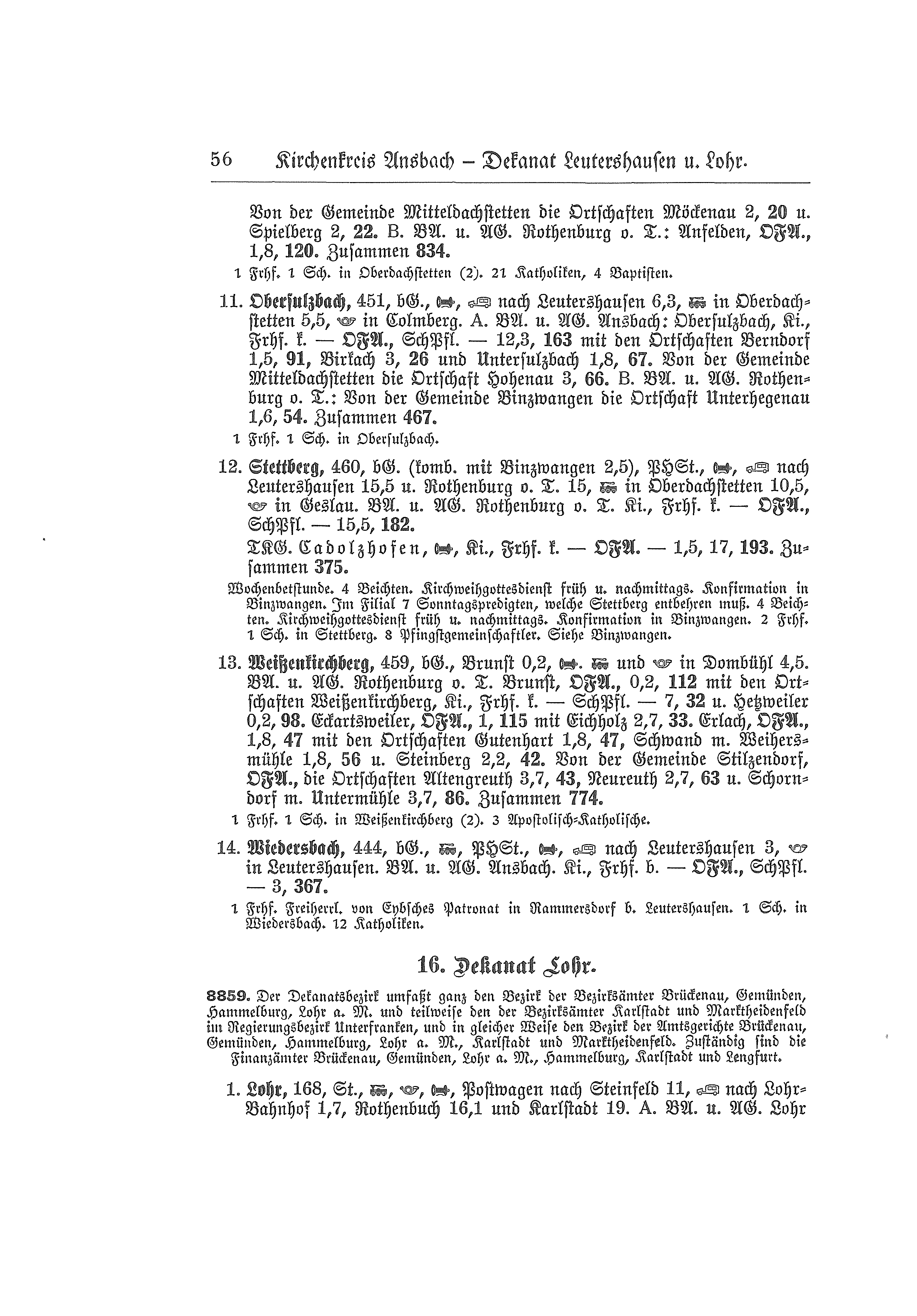 457 m, Markt, Post, Telefon, Bus nach Leutershausen-Wiedersbach 9,6 km und Rothenburg o. T. 18,3 km, Bahn in Lehrberg 7,5 km. A. Bezirksamt und Amtsgericht Ansbach: Colmberg, Kirche, Friedhof konfessionell evangelisch - Ortsfürsorgeausschuß (Pfarrer Vorsitz), Schulpflegschaft - 6,3 km, 502 Seelen.