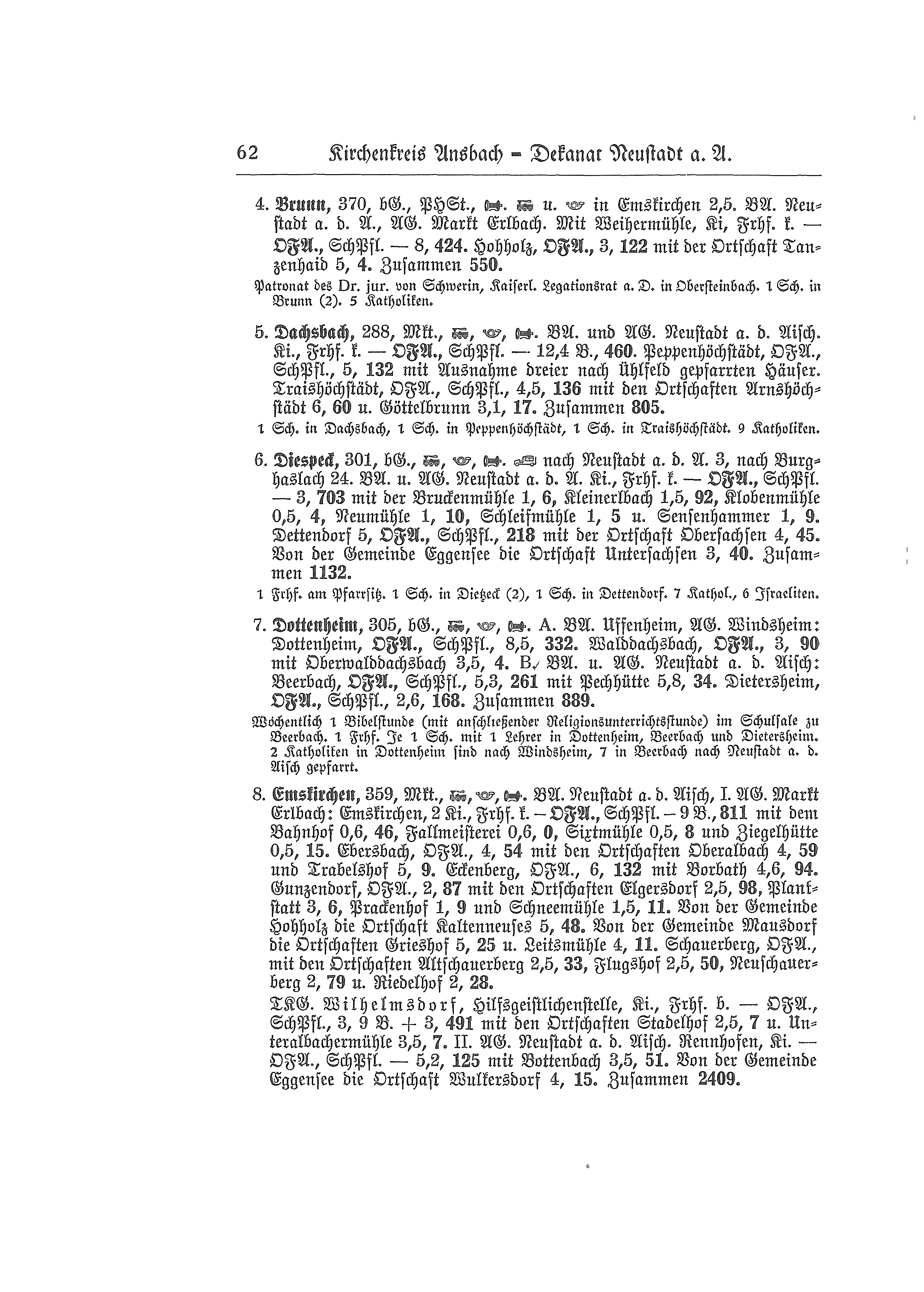 318 m, bürgerliche Gemeinde, Bahn in Dottenheim 2 km, Post in Dottenheim 1 km. Bezirksamt Uffenheim, Amtsgericht Windsheim. Kirche, Friedhof bürgerlich - Ortsfürsorgeausschuß, Schulpflegschaft - 2 km + 6 Bahnkilometer, 285 Seelen mit Hausenhof 2 km, 7 Seelen, Schormühle 1 km, 5 Seelen. Zusammen 297 Seelen.