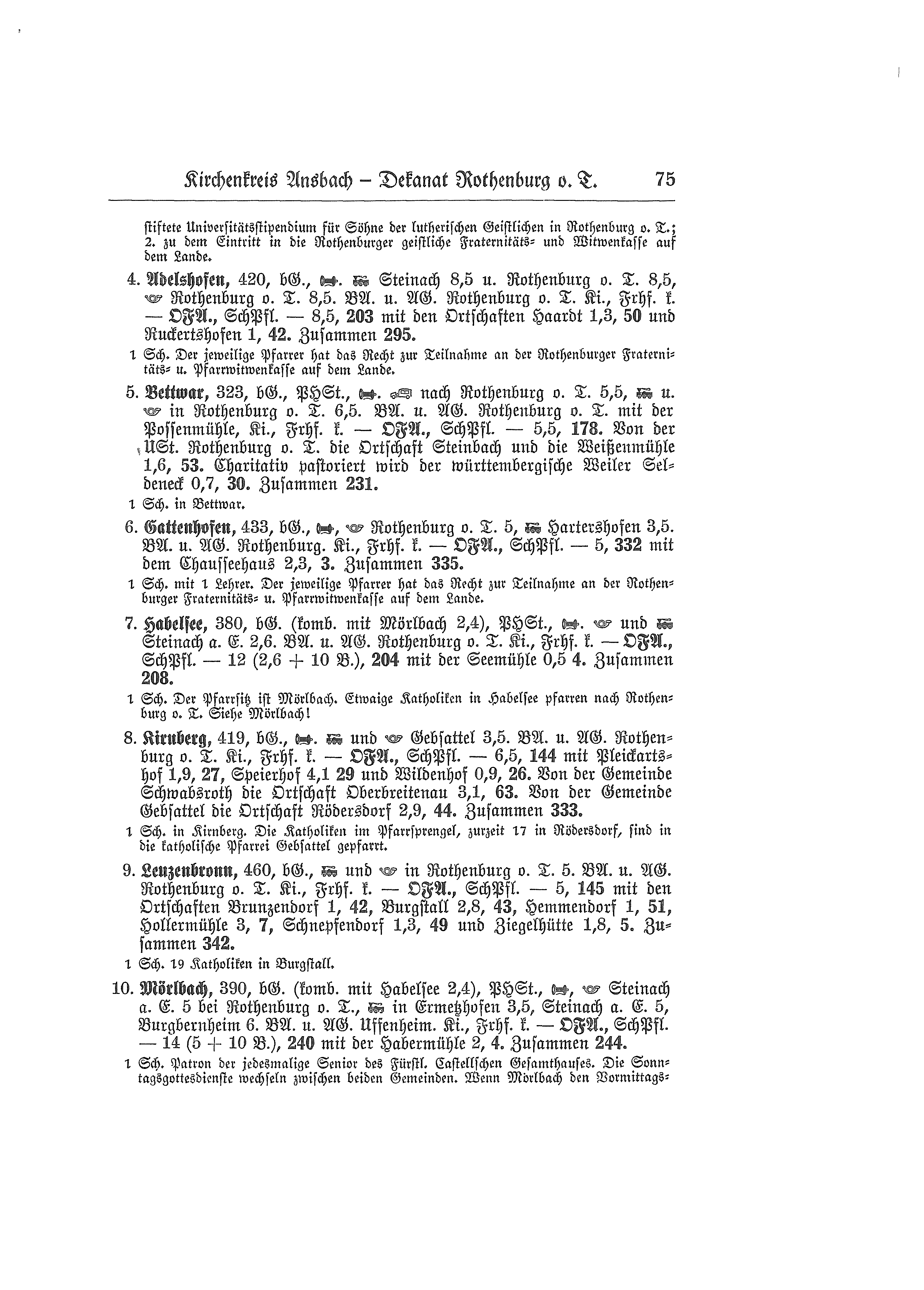 A. Unmittelbare Stadt Rothenburg o. T.: St. Leonhard oder Siechhaus, Kirche, Friedhof bürgerlich - Schulpflegschaft - 1,6 km, 43 Seelen mit Haltenmühle 1,4 km, 9 Seelen, Siechenmühle 1,9 km, 10 Seelen und Walkmühle 1,2 km, 2 Seelen. B. Bezirksamt und Amtsgericht Rothenburg o. T.: Gebsattel, Friedhof bürgerlich - Ortsfürsorgeausschuß - 3,7 km, 305 Seelen mit Wasenmühle und Eckartshof 3,7 km, 1 Seelen. Zusammen 370 Seelen.