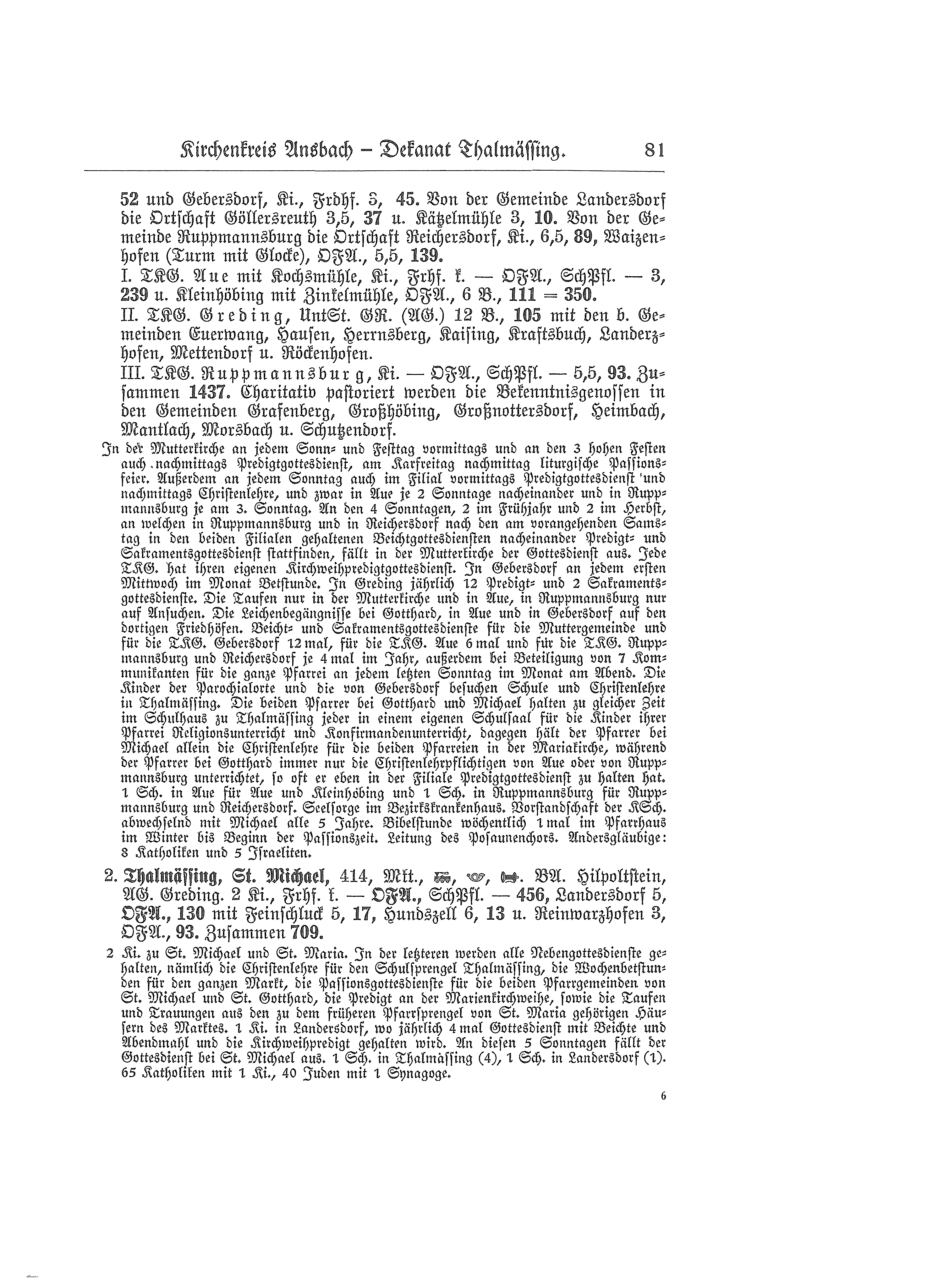 408 m, Markt, Post, Telefon. Bezirksamt Hilpoltstein, Amtsgericht Greding. Kirche, Friedhof konfessionell evangelisch mit Totenkapelle - Ortsfürsorgeausschuß, Kinderschule gemeinsam mit St. Michael, Schulpflegschaft, Thalmässing mit seinem östlichen unteren Teil, den Häusern [der] Nummern 49, 52-102, 144-147 nebst Armenhaus und Bezirkskrankenhaus, 449 Seelen. Hagenich mit den Ortschaften Eckmannshofen 1 km, 52 Seelen und Gebersdorf, Kirche, Friedhof 3 km, 45 Seelen.