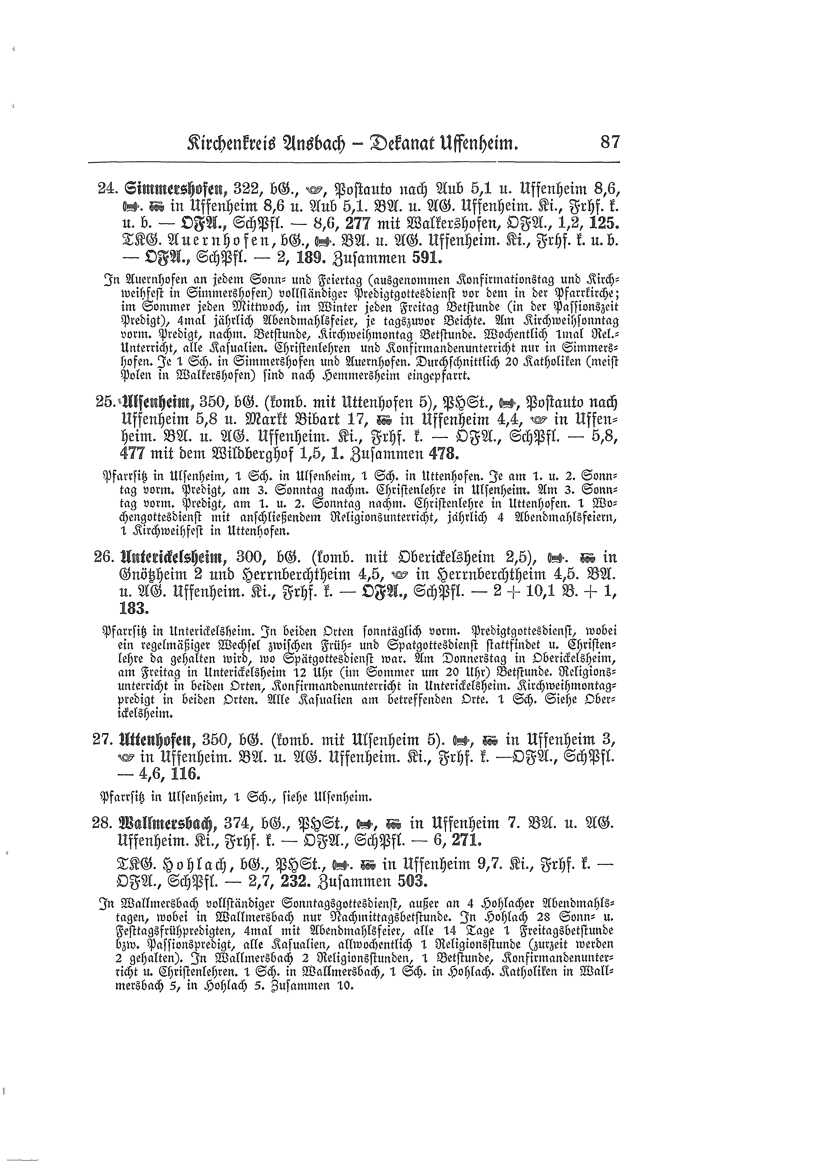 300 m, bürgerliche Gemeinde (komb. mit Unterickelsheim 2,5 km), Telefon. Bahn in Gnötzheim 4 km und Herrnberchtheim 5,4 km, Post in Herrnberchtheim 5,4 km. Bezirksamt und Amtsgericht Uffenheim. Kirche, Friedhof konfessionell evangelisch - Ortsfürsorgeausschuß (Pfarrer Vorsitz), Schulpflegschaft - 4 km + 10,1 Bahnkilometer + 1 km, 258 Seelen. Rodheim 2,5 km, 0 Seelen.