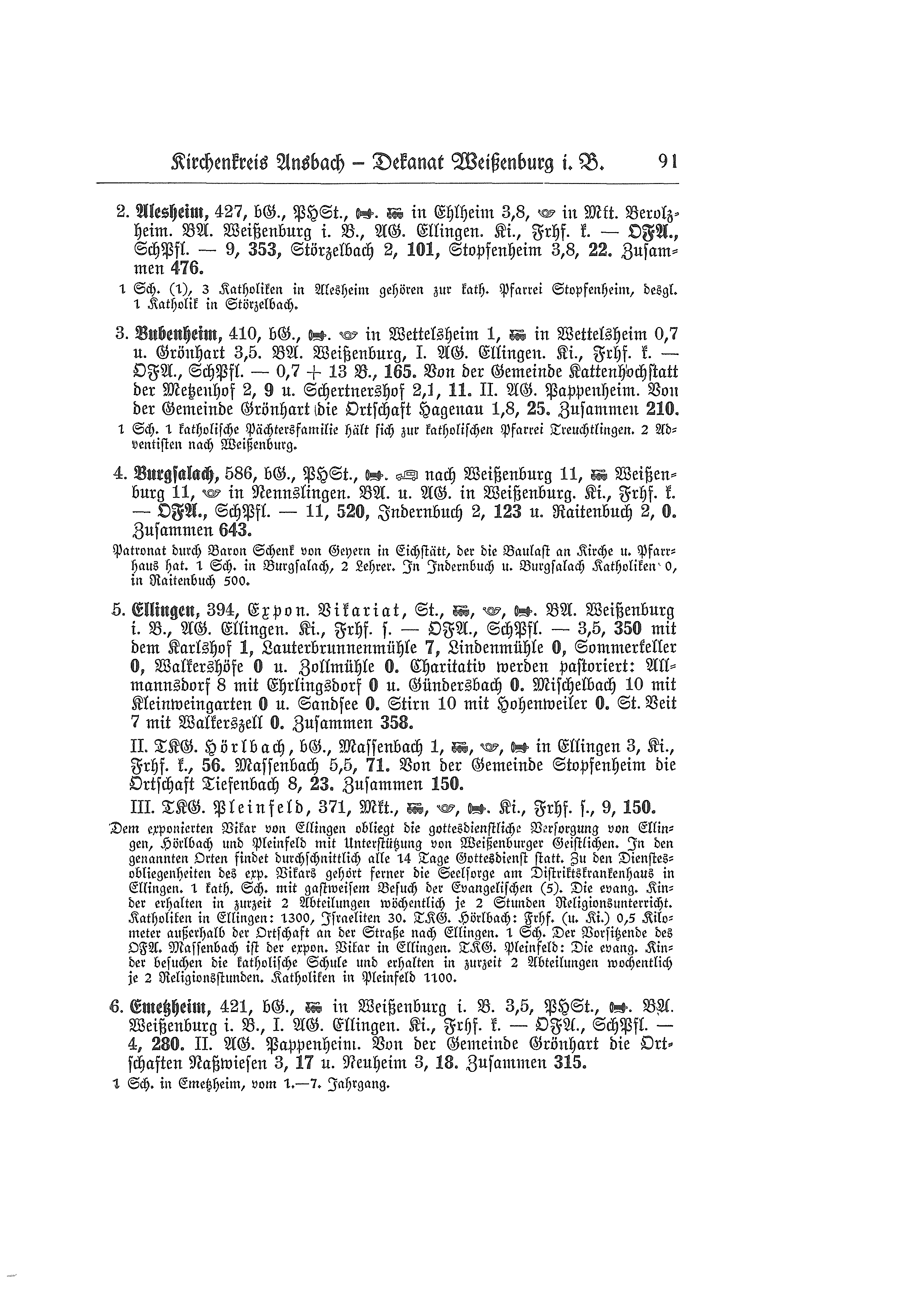 12.470 Seelen. Der Dekanatsbezirk umfaßt den Bezirk des Bezirksamtes Weißenburg i. B. und den Bezirk der unmittelbaren Stadt Weißenburg i. B. im Regierungsbezirk Mittelfranken und die Amtsgerichte Weißenburg i. B., Ellingen und Pappenheim, letzteres nur in kleinen Teilen. Zuständig ist das Finanzamt Weißenburg i. B.