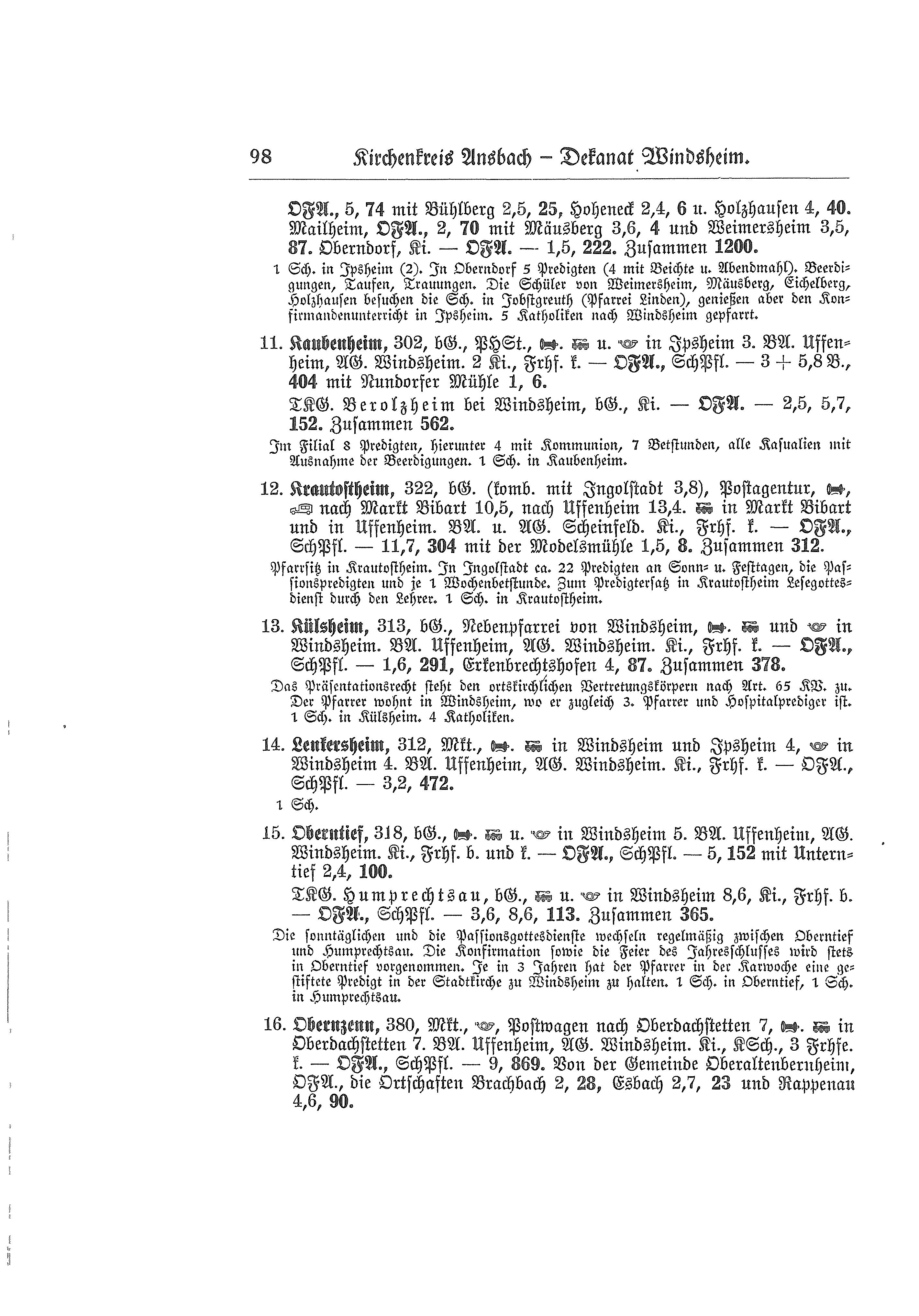 391 m, Markt, Post, Telefon. Bezirksamt Uffenheim, Amtsgericht Windsheim. Kirche, Friedhof konfessionell evangelisch - Ortsfürsorgeausschuß, Schulpflegschaft - 9,5 km, 1.542 Seelen, Aumühle 2,5 km, 8 Seelen, Erlmühle 2,5 km, 3 Seelen, Hagenmühle 2,5 km, 8 Seelen, Hilpertshof 4,5 km, 19 Seelen, Hochbach 4 km, 63 Seelen, Wildbad 4,5 km, 7 Seelen. Zusammen 1.650 Seelen.