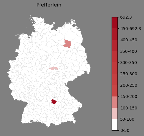 Relative Verteilung des Namens Pfefferlein (1996)Direkt zur Karte Die Farbskala zeigt die Anzahl von "Pfefferlein" bezogen auf je 1 Million Einträge. |