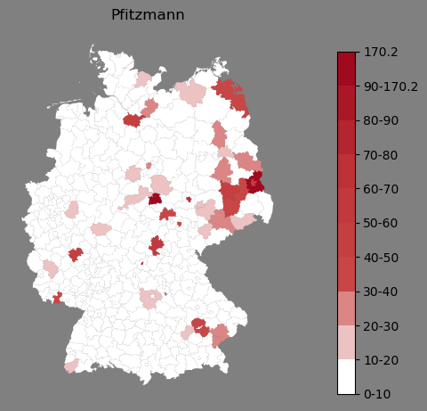 Relative Verteilung des Namens Pfitzmann (1996)Direkt zur Karte Die Farbskala zeigt die Anzahl von "Pfitzmann" bezogen auf je 1 Million Einträge. |