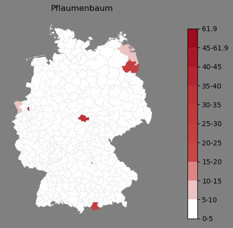 Relative Verteilung des Namens Pflaumenbaum (1996)Direkt zur Karte Die Farbskala zeigt die Anzahl von "Pflaumenbaum" bezogen auf je 1 Million Einträge. |