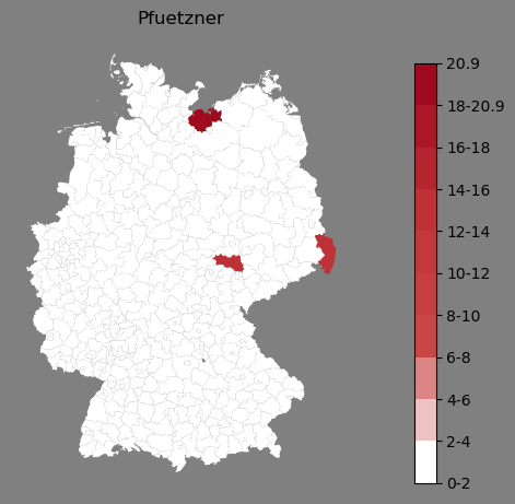Relative Verteilung des Namens Pfuetzner (1996)Direkt zur Karte Die Farbskala zeigt die Anzahl von "Pfuetzner" bezogen auf je 1 Million Einträge. |