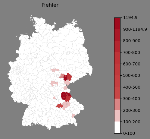 Relative Verteilung des Namens Piehler (1996)Direkt zur Karte Die Farbskala zeigt die Anzahl von "Piehler" bezogen auf je 1 Million Einträge. |