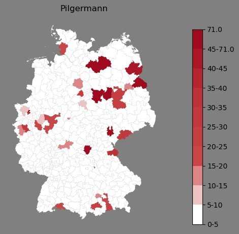 Relative Verteilung des Namens Pilgermann (1996)Direkt zur Karte Die Farbskala zeigt die Anzahl von "Pilgermann" bezogen auf je 1 Million Einträge. |
