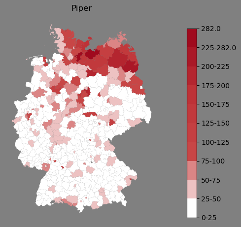 Absolute Verteilung des Namens Piper (1890)Direkt zur Karte Absolute Verteilung des Namens "Piper" um 1890 im damaligen Deutschen Reich Sie können die Karte innerhalb des Fensters zoomen und verschieben. |