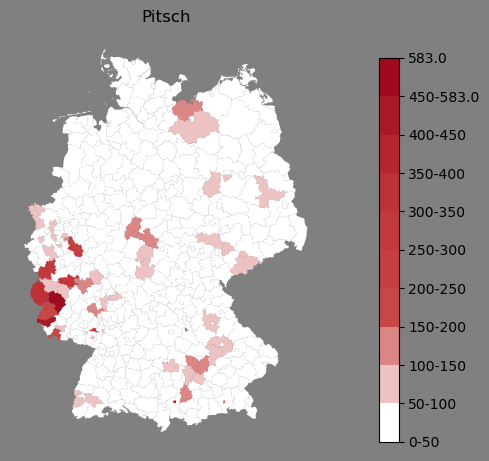Relative Verteilung des Namens Pitsch (1996)Direkt zur Karte Die Farbskala zeigt die Anzahl von "Pitsch" bezogen auf je 1 Million Einträge. |