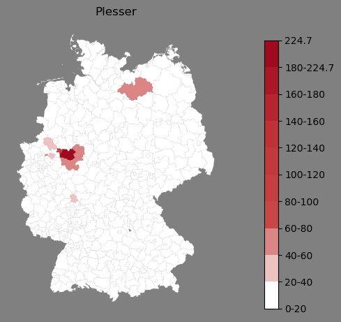 Relative Verteilung des Namens Plesser (1996)Direkt zur Karte Die Farbskala zeigt die Anzahl von "Plesser" bezogen auf je 1 Million Einträge. |