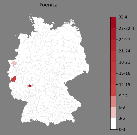 Relative Verteilung des Namens Poenitz (1996)Direkt zur Karte Die Farbskala zeigt die Anzahl von "Poenitz" bezogen auf je 1 Million Einträge. |