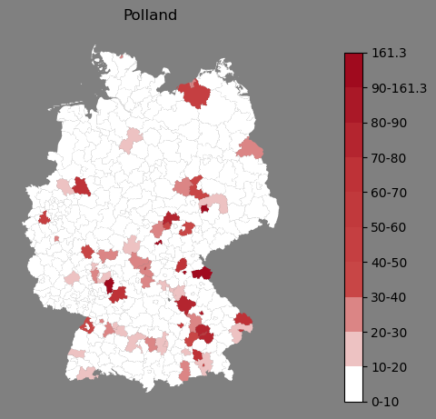 Relative Verteilung des Namens Polland (1996)Direkt zur Karte Die Farbskala zeigt die Anzahl von "Polland" bezogen auf je 1 Million Einträge. |