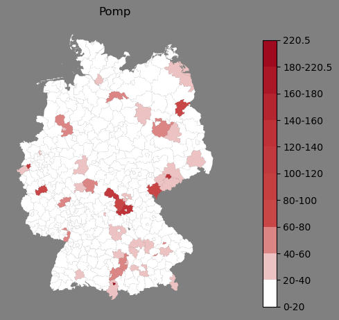 Relative Verteilung des Namens Pomp (1996)Direkt zur Karte Die Farbskala zeigt die Anzahl von "Pomp" bezogen auf je 1 Million Einträge. |