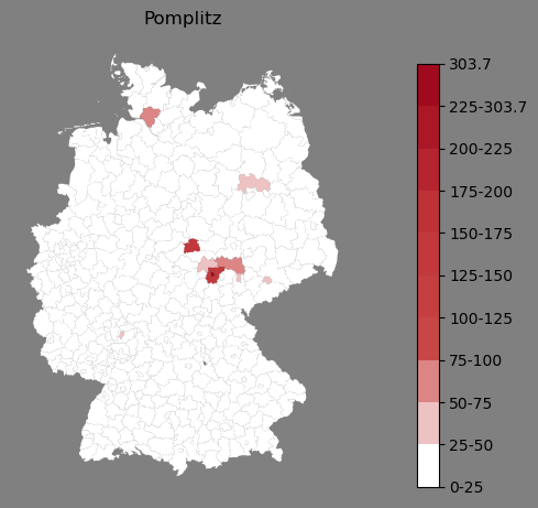 Relative Verteilung des Namens Pomplitz (1996)Direkt zur Karte Die Farbskala zeigt die Anzahl von "Pomplitz" bezogen auf je 1 Million Einträge. |