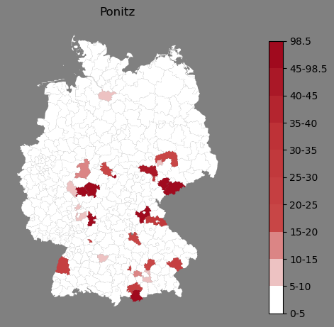 Relative Verteilung des Namens Ponitz (1996)Direkt zur Karte Die Farbskala zeigt die Anzahl von "Ponitz" bezogen auf je 1 Million Einträge. |