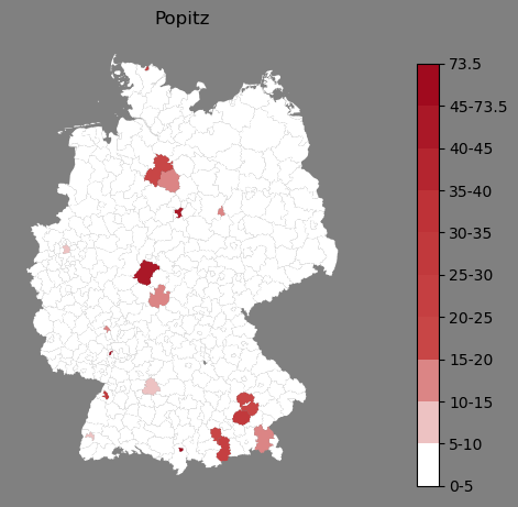 Relative Verteilung des Namens Popitz (1996)Direkt zur Karte Die Farbskala zeigt die Anzahl von "Popitz" bezogen auf je 1 Million Einträge. |