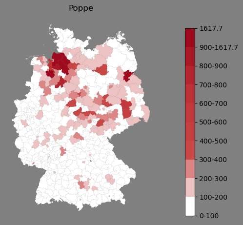 Relative Verteilung des Namens Poppe (1996)Direkt zur Karte Die Farbskala zeigt die Anzahl von "Poppe" bezogen auf je 1 Million Einträge. |