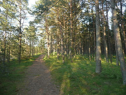 - Ein schmaler Sandweg führt durch dunklen Tann.