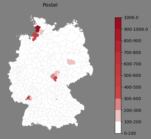 Relative Verteilung des Namens Postel (1996)Direkt zur Karte Die Farbskala zeigt die Anzahl von "Postel" bezogen auf je 1 Million Einträge. |