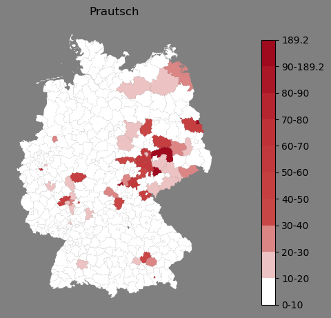Relative Verteilung des Namens Prautsch (1996)Direkt zur Karte Die Farbskala zeigt die Anzahl von "Prautsch" bezogen auf je 1 Million Einträge. |