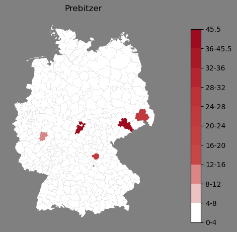 Relative Verteilung des Namens Prebitzer (1996)Direkt zur Karte Die Farbskala zeigt die Anzahl von "Prebitzer" bezogen auf je 1 Million Einträge. |