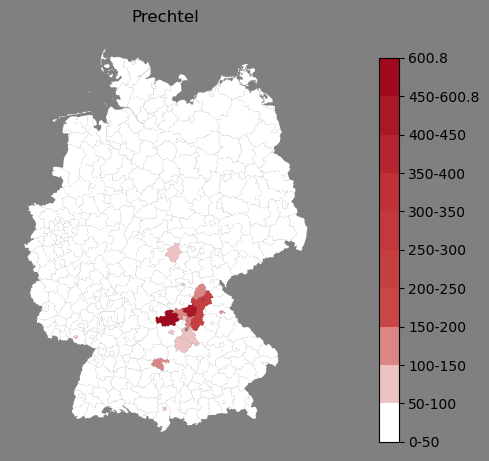 Absolute Verteilung des Namens Prechtel (1890)Direkt zur Karte Absolute Verteilung des Namens "Prechtel" um 1890 im damaligen Deutschen Reich Sie können die Karte innerhalb des Fensters zoomen und verschieben. |
