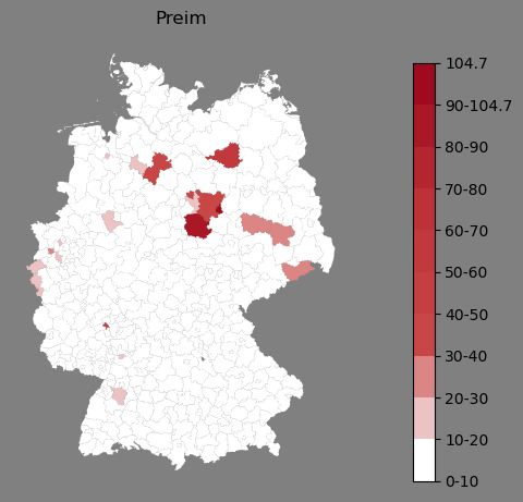 Relative Verteilung des Namens Preim (1996)Direkt zur Karte Die Farbskala zeigt die Anzahl von "Preim" bezogen auf je 1 Million Einträge. |