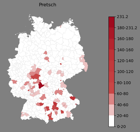 Relative Verteilung des Namens Pretsch (1996)Direkt zur Karte Die Farbskala zeigt die Anzahl von "Pretsch" bezogen auf je 1 Million Einträge. |
