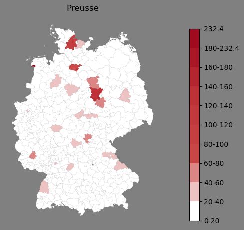Absolute Verteilung des Namens Preusse (1890)Direkt zur Karte Absolute Verteilung des Namens "Preusse" um 1890 im damaligen Deutschen Reich Sie können die Karte innerhalb des Fensters zoomen und verschieben. |