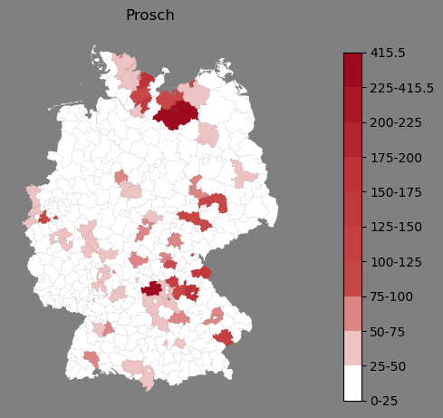 Relative Verteilung des Namens Prosch (1996)Direkt zur Karte Die Farbskala zeigt die Anzahl von "Prosch" bezogen auf je 1 Million Einträge. |