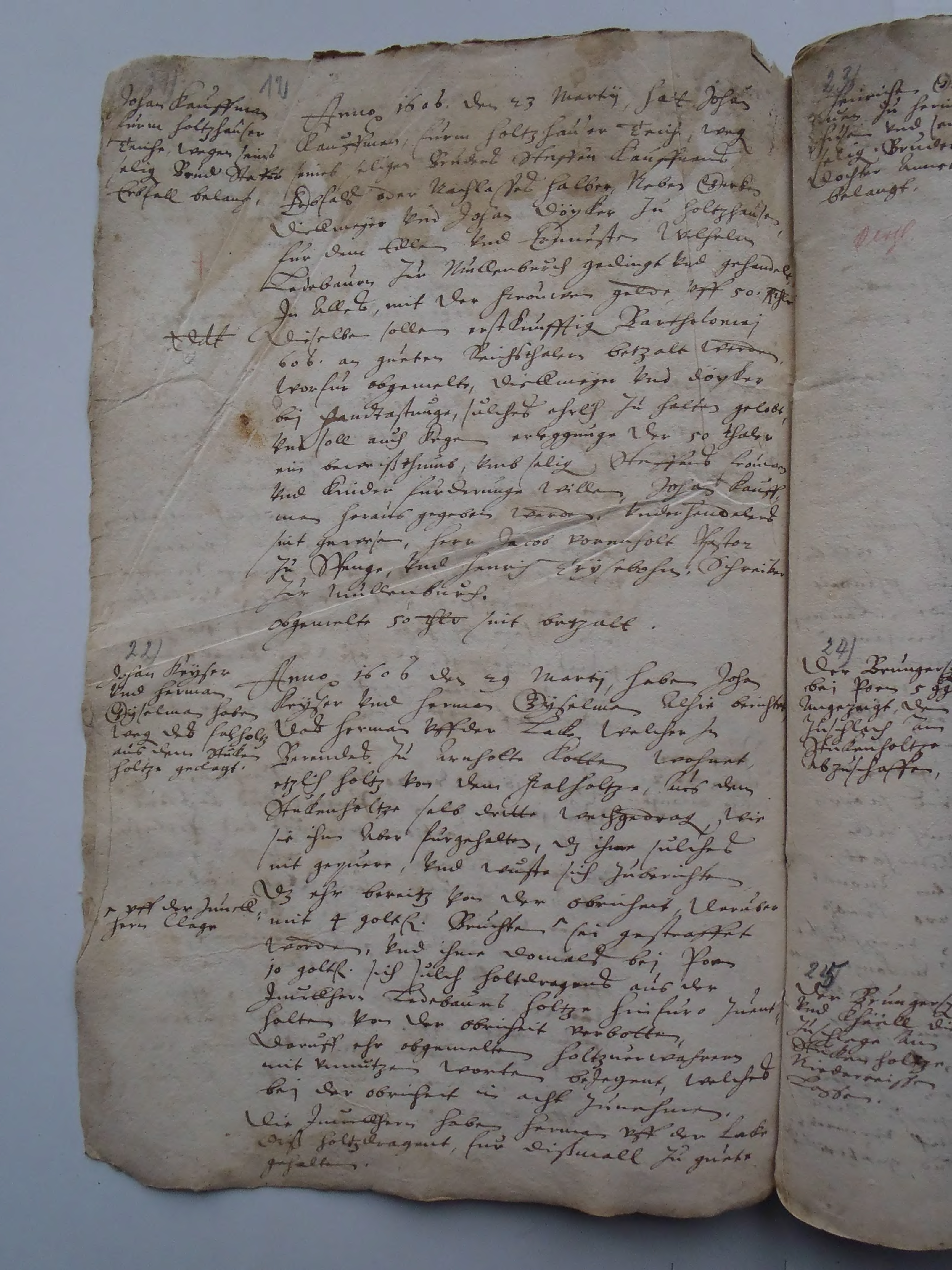 Anno 1606 den 23 Marty, hatt Johan Kauffman, fürm Holtzhauser Teich, wegen seines seligen Bruders Steffen Kauffmans Erbfall oder Nachlasses halber, neben Gerken Dickmeyer und Johan Döpker zu Holtzhausen, für dem Edlen und Ernvesten Wilhelm Ledebaure zur Müllenburch gedingt und gehandelt in alles, mit der Frouwen Gelde uff 50 Thaler. Dieselben sollen erstkünfftigen Bertholomei 606 an gueten Reichsthalern betzalt werden, worfür ogmemelte, Dickmeyer und Döpker bei Handtastunge, sülches ehrlich zu halten gelobt, und soll auch kegen Erleggunge der 50 Thaler ein Beweißthumb, umb seligen Steffens Frouwen und Kinder Fürderunge Willen, Johan Kauffman heraus gegeben werden. Underhendelens sint gewesen, Herr Jacob Vorenholt Pastor zu Spenge, und Henrich Trysebohm, Schreiber zur Müllenburch. Obgemelte 50 Thaler sint betzalt.