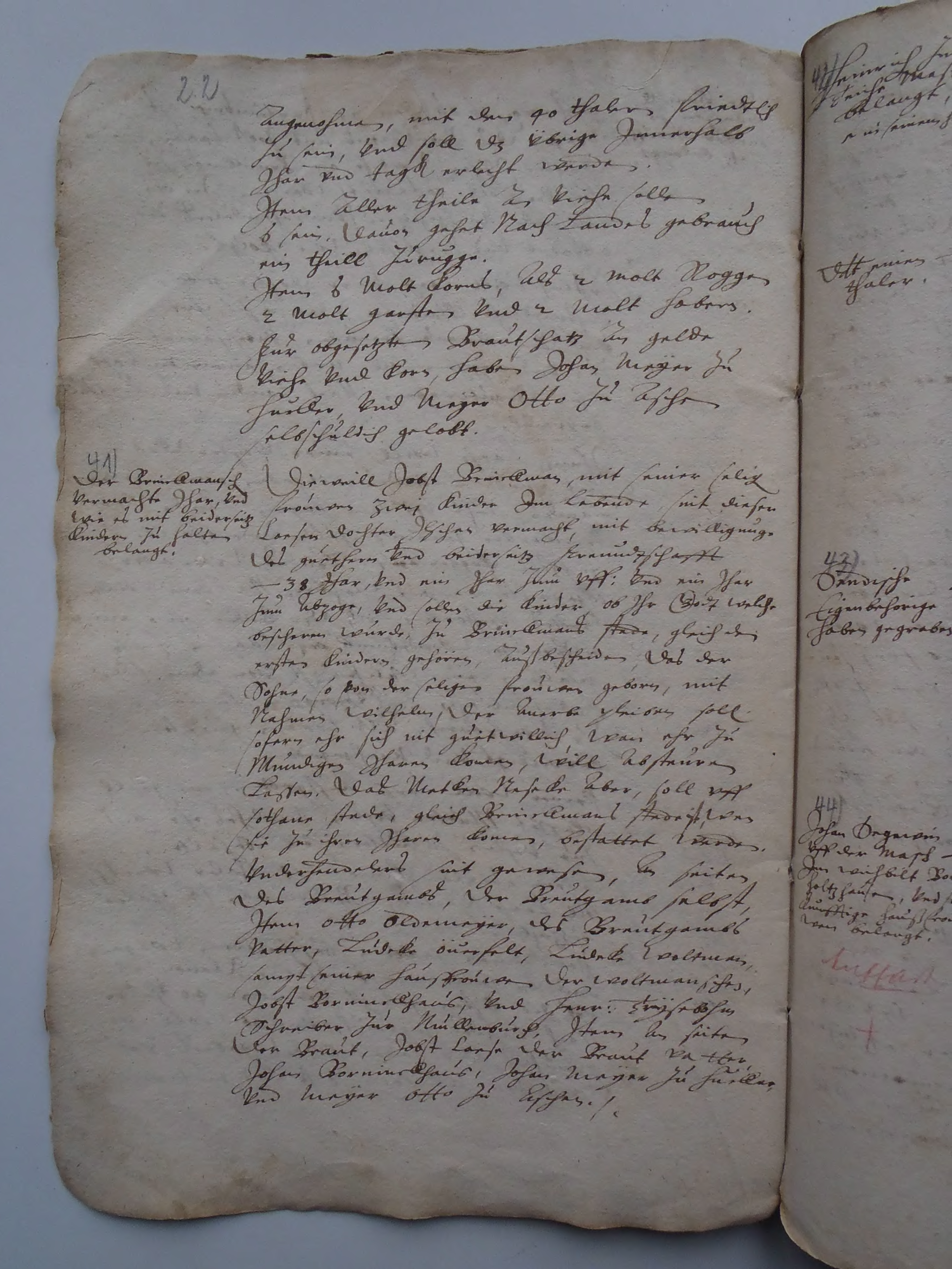 Dieweill Jobst Brinckman, mit seiner seligen Frouwen zwei Kinder am Lebende, sint dieser Caesen Dochter Ilschen vermacht, mit Bewilligunge des Guethern und beiderseitz Freundtschafft 38 Jhar, und ein Jhar zum Uff- und ein Jhar zum Abzoge, und sollen die Kinder, ob Ihr Godt welche bescheren würde, zu Brinkmans Stede, gleich den ersten Kindern gehören, außbescheiden, das der Sohne, so von der seligen Frouwen geborn, mit Nahmen Wilhelm, der Anerbe pleiben soll. Sofern ehr sich nit guetwillich, wan ehr zu mündigen Jharen komen, will absteuren lassen. Das Metken Neseke aber, soll uff sothane Stede, gleich Brinckmans Stede ist, wen sie zu ihren Jharen komen, bestattet werden. Underhendelers sint gewesen, an Seiten des Breutgambs, der Breutgamb selbst, item Otto Oldemeyer, des Breutgambs Vatter, Lüdeke Överfelt, Lüdeke Woltman, sampt seiner Hausfrouwen der Woltmanschen, Jobst Borninckhaus, und Henr. Trysebohm Schreiber zur Müllenburch, item an Seiten der Braut, Jobst Caese der Braut Vatter, Johan Borninckhaus, Johan Meyer zu Hücker, und Meyer Otto zu Aschen.
